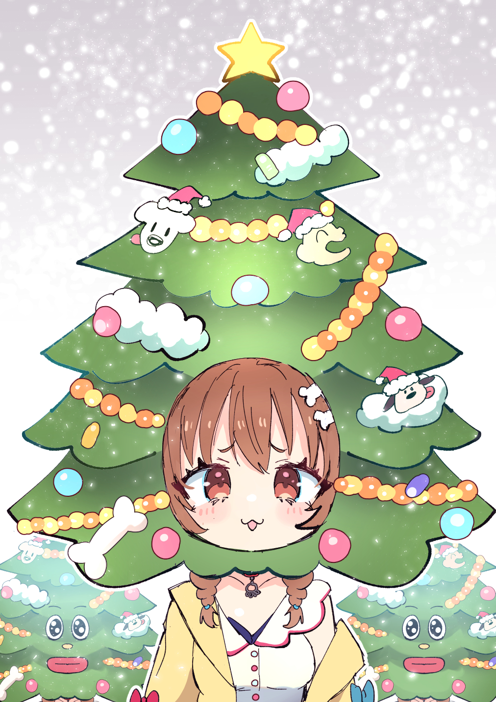 1girl :3 bone_hair_ornament braid brown_hair buttons christmas_ornaments christmas_tree coat eyelashes futo-inu hair_ornament highres hololive hoso-inu inugami_korone jewelry kamiya_zuzu listener_(inugami_korone) looking_at_viewer necklace no_nose open_mouth shirt snow star_(symbol) twin_braids upper_body virtual_youtuber white_shirt yellow_coat