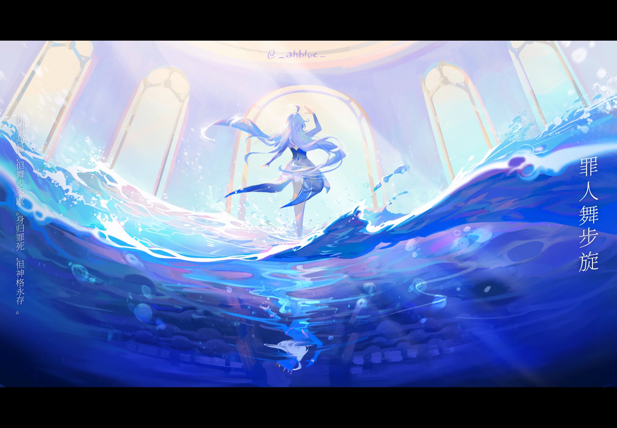 ahblue ahoge air_bubble asymmetrical_gloves bubble commentary dress focalors_(genshin_impact) from_behind full_body furina_(genshin_impact) genshin_impact gloves hat highres letterboxed light_rays long_hair long_sleeves medium_hair mismatched_gloves reflection standing sunlight top_hat translation_request twitter_username very_long_hair water white_hair