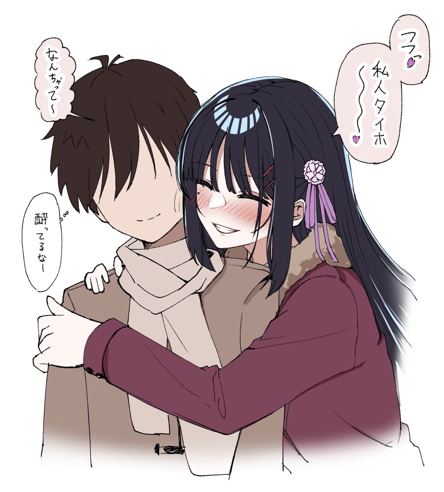 1boy 1girl ^_^ black_hair blush brown_hair cafe_stella_to_shinigami_no_chou closed_eyes coat cropped_torso drunk flirting flower fur-trimmed_coat fur_trim grin hair_between_eyes hair_flower hair_ornament hair_ribbon hairclip hand_on_another's_shoulder happy heads_together hetero highres hug long_hair long_sleeves mole mole_under_eye no_eyes nose_blush official_alternate_costume pink_ribbon red_coat ribbon rose shiki_natsume short_hair sidelocks simple_background smile speech_bubble straight_hair takamine_kousei tft_(tft7822) thought_bubble translated upper_body very_long_hair white_background white_flower white_rose winter_clothes