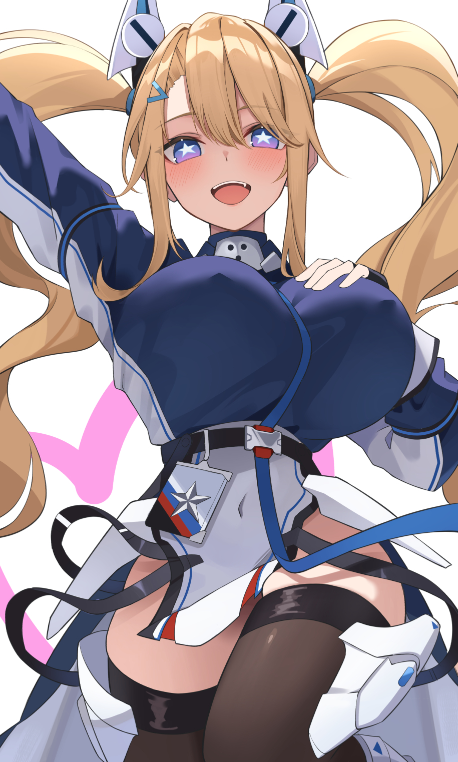1girl azur_lane black_thighhighs blonde_hair blue_eyes breasts cowboy_shot fingerless_gloves gloves guam_(azur_lane) hand_on_own_chest heart heart_sticker highres large_breasts long_hair looking_at_viewer open_mouth shirt skirt smile soar_sora222 solo star-shaped_pupils star_(symbol) sticker symbol-shaped_pupils thighhighs twintails very_long_hair
