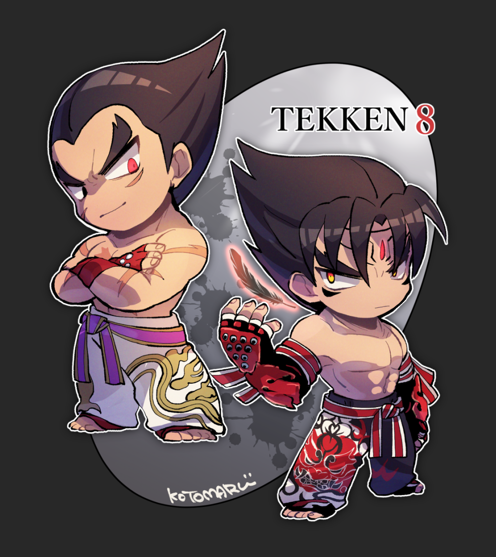 2boys barefoot belt black_eyes black_hair black_pants chibi closed_mouth copyright_name crossed_arms facial_mark feathers fingerless_gloves forehead_jewel gloves heterochromia kazama_jin kotomaru_(kotokoto_kottan) looking_to_the_side male_focus mishima_kazuya multiple_boys no_nose orange_eyes pants pectorals purple_belt red_belt red_eyes red_gloves scar scar_on_arm scar_on_chest signature studded_gloves tekken tekken_8 thick_eyebrows topless_male v-shaped_eyebrows