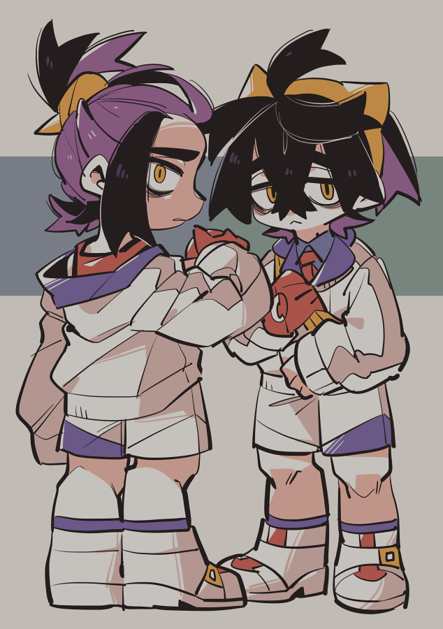 2boys :< ahoge bags_under_eyes black_hair blue_shirt collared_shirt commentary_request crossed_bangs dual_persona frown full_body gloves hair_between_eyes hair_tie hair_tied hair_up hairband jacket kieran_(pokemon) looking_at_viewer looking_back looking_to_the_side loose_hair_strand lunchbox_(artist) male_focus mole mole_on_neck multicolored_hair multiple_boys necktie nintendo parted_lips partially_fingerless_gloves pokemon pokemon_scarlet_and_violet ponytail purple_hair red_necktie red_tank_top shirt short_hair shorts simple_background strap tank_top two-tone_hair white_footwear white_jacket white_shorts yellow_eyes