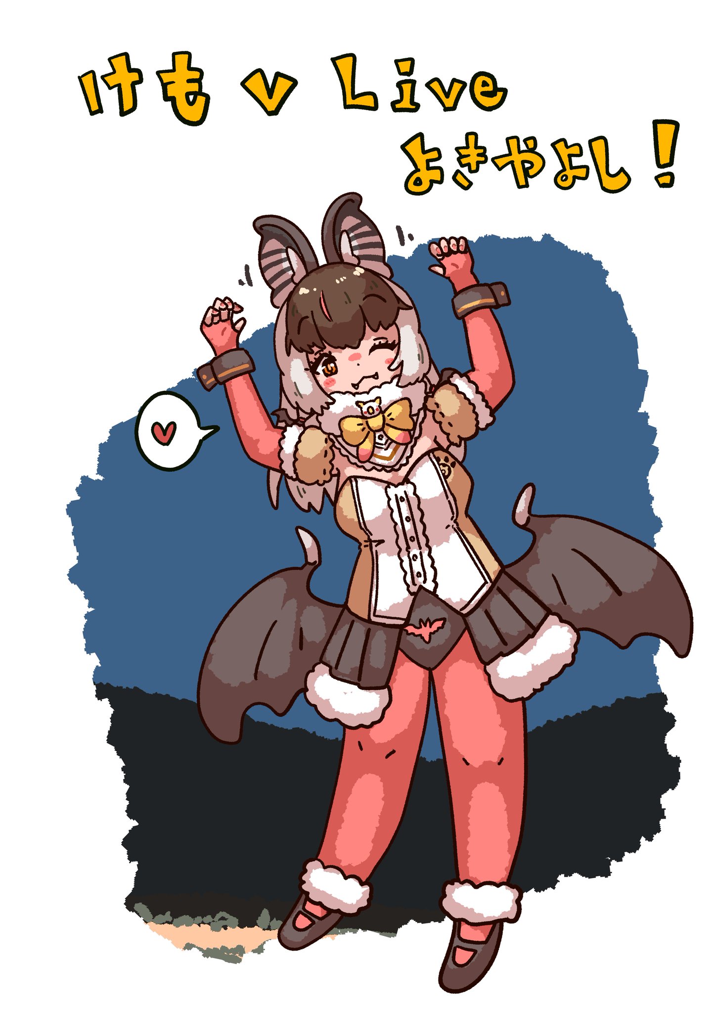 1girl animal_ears bat_ears bat_girl bat_wings brown_eyes brown_hair brown_long-eared_bat_(kemono_friends) elbow_gloves enokeyaki extra_ears fingerless_gloves full_body gloves grey_hair highres kemono_friends kemono_friends_v_project leotard long_hair looking_at_viewer microphone one_eye_closed pantyhose shoes simple_background skirt solo translation_request virtual_youtuber wings
