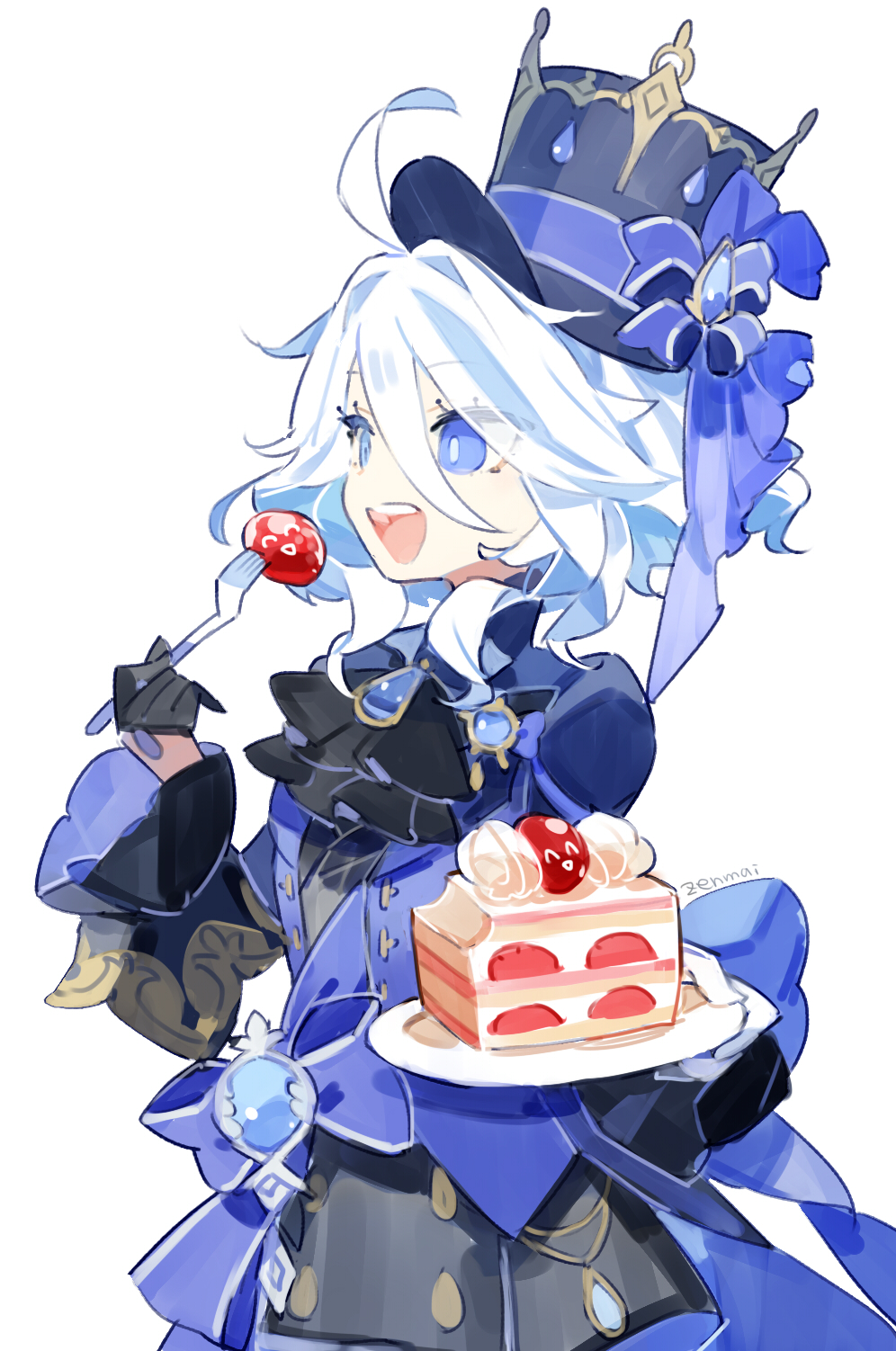 1girl ahoge asymmetrical_gloves black_gloves black_hat black_shirt blue_bow blue_coat blue_eyes bow brooch cake cake_slice coat commentary eating food fork fruit furina_(genshin_impact) genshin_impact gloves half_gloves hat hat_bow hat_ribbon heterochromia highres holding holding_fork holding_plate jewelry mismatched_gloves open_mouth plate ribbon shirt short_hair sidelocks simple_background smile solo strawberry tailcoat top_hat twitter_username upper_body vision_(genshin_impact) white_background white_gloves zenmai_(cyenmi3)