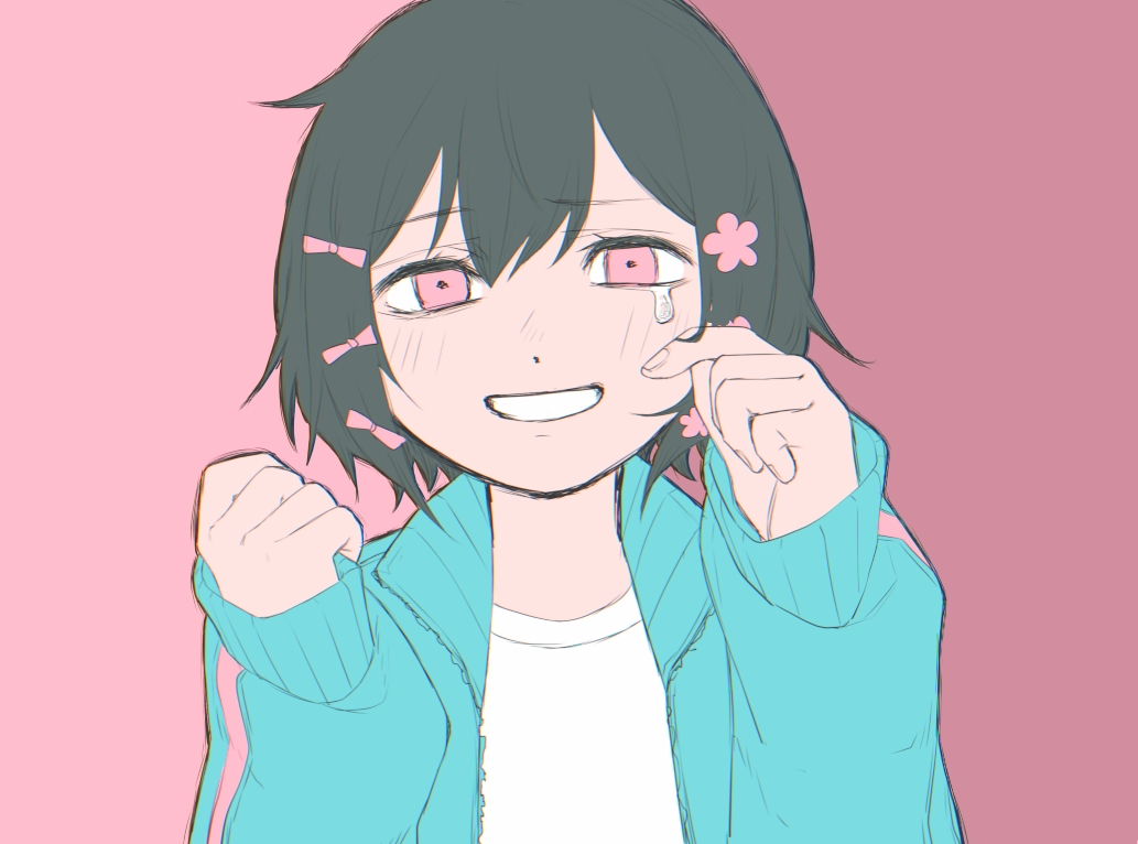 1girl aqua_jacket bags_under_eyes black_hair bow empty_eyes false_smile flower hair_bow hair_flower hair_ornament jacket kono_mikan kurari-chan_(iyowa) kyu-kurarin_(cevio) pink_background pink_eyes shirt short_hair simple_background smile solo tears teeth track_jacket white_shirt wiping_tears