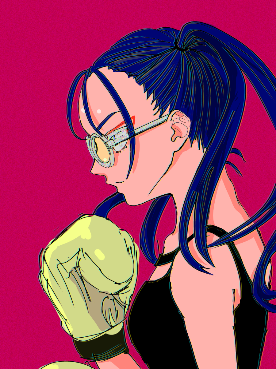 1girl ado_(utaite) aeiikichi black_tank_top blue_eyes blue_hair boxing_gloves chromatic_aberration cloud_nine_inc commentary_request highres long_hair odo_(song) partial_commentary pink_background solo sunglasses tank_top twintails upper_body
