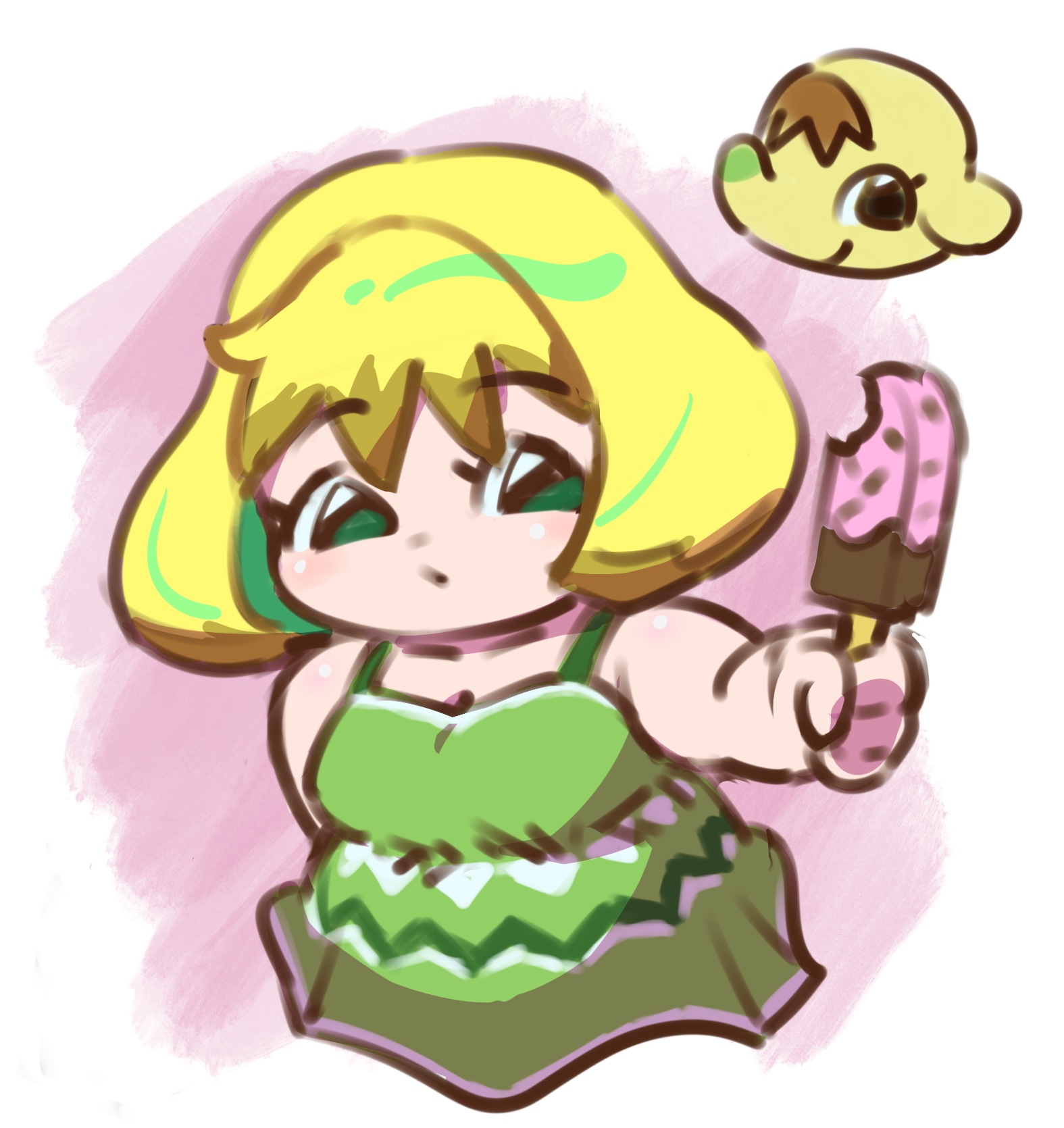 animal_crossing blonde_hair bob_cut breasts dress elephant eloise_(animal_crossing) food green_eyes highres humanization ice_cream kopa_nishikida medium_breasts multicolored_hair nintendo plump sleeveless sleeveless_dress solo