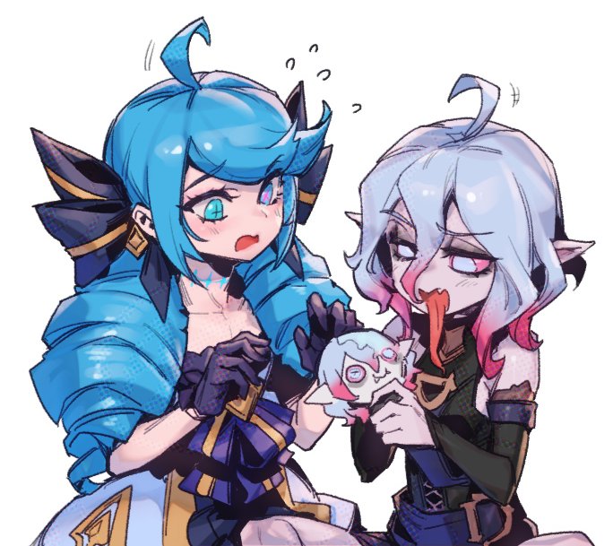 2girls ahoge black_gloves blue_eyes blue_hair blush briar_(league_of_legends) colored_eyelashes colored_sclera commentary drill_hair english_commentary fang from_side gloves grey_hair gwen_(league_of_legends) hair_between_eyes holding holding_stuffed_toy league_of_legends lolita_fashion long_hair long_tongue multicolored_hair multiple_girls no_pupils open_mouth phantom_cross pink_hair red_sclera simple_background skin_fang streaked_hair stuffed_animal stuffed_toy sweatdrop tongue tongue_out two-tone_hair vampire white_background white_eyes