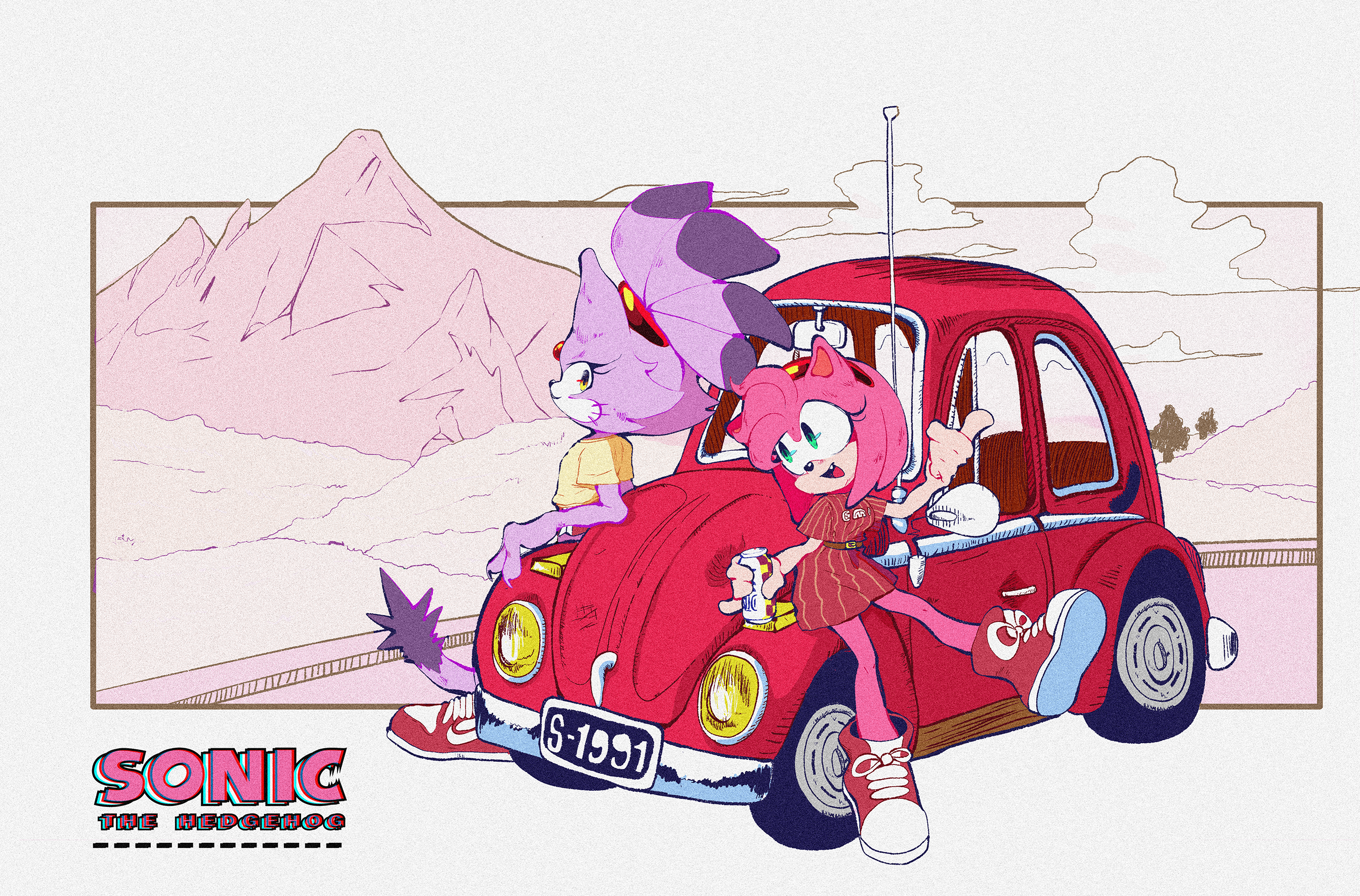 2girls alternate_costume amy_rose animal_ears animal_nose arm_up belt blaze_the_cat body_fur border breasts can car cat_ears cat_girl cat_tail cloud colored_tips copyright_name day dress drink_can english_text fang female_focus flat_chest full_body furry furry_female grey_border hair_tie hairband happy head_tilt highres holding holding_can index_finger_raised leaning_on_object leg_up looking_back motor_vehicle mountain multicolored_hair multiple_girls nano_(nanolovesyou) open_mouth outdoors outside_border pink_fur pink_hair pinky_out pinstripe_dress pinstripe_pattern profile purple_fur purple_hair red_dress red_footwear red_hairband shirt shoes short_dress short_hair short_sleeves sidelocks small_breasts smile sneakers soda_can sonic_(series) standing standing_on_one_leg striped tail topknot two-tone_hair volkswagen_beetle whiskers yellow_eyes yellow_shirt