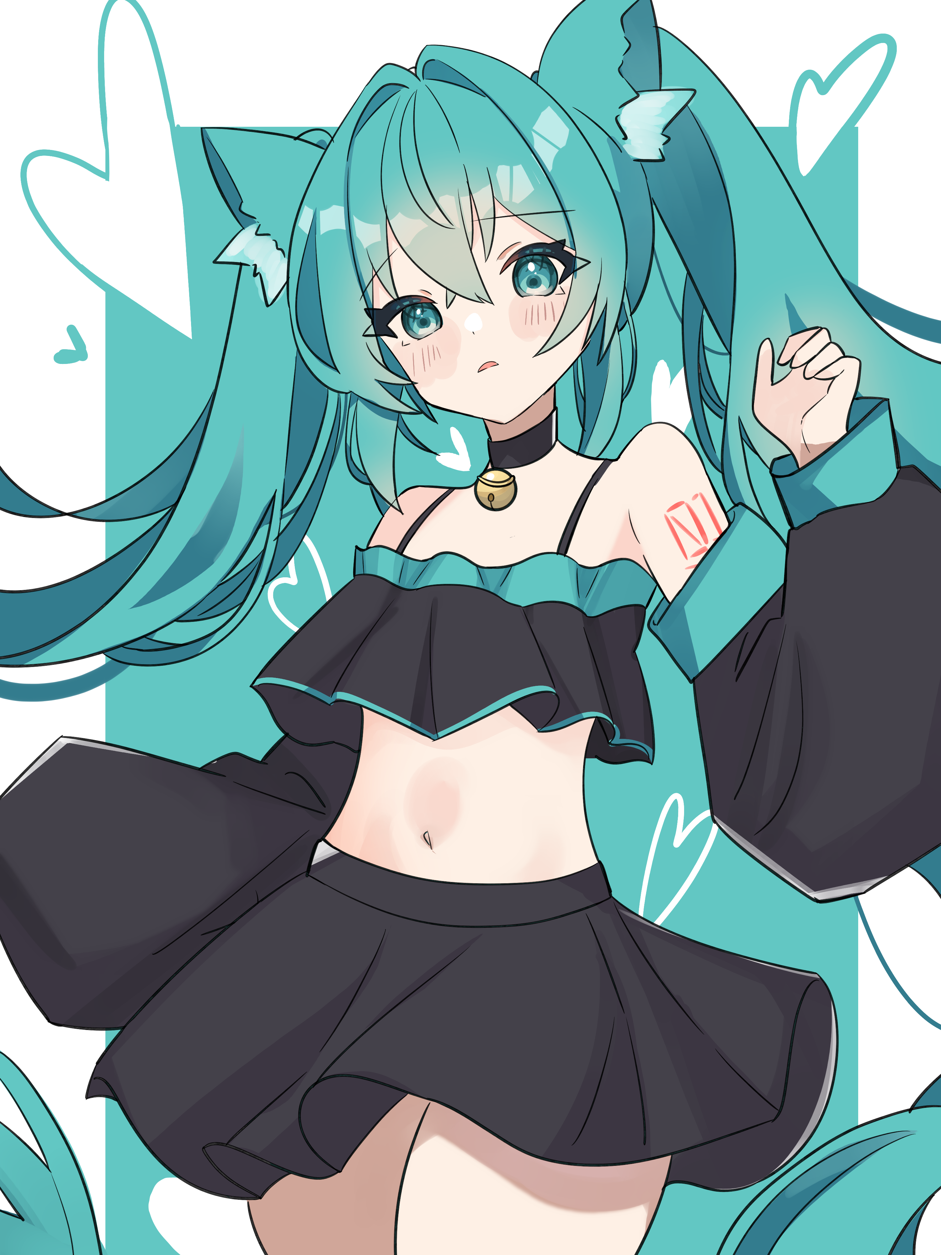 1girl absurdres alternate_costume animal_ear_fluff animal_ears aqua_background aqua_eyes aqua_hair aqua_trim bare_shoulders bell black_shirt black_skirt black_sleeves blue_background blue_eyes blue_hair blue_trim blush cat_ears coco_irasuto collar commentary_request cowboy_shot crop_top detached_sleeves hair_between_eyes hair_intakes hand_up hatsune_miku heart highres jingle_bell long_hair midriff navel neck_bell number_tattoo open_mouth pleated_shirt pleated_skirt shirt skirt solo stomach tattoo transparent_background twintails two-tone_background very_long_hair vocaloid wide_sleeves