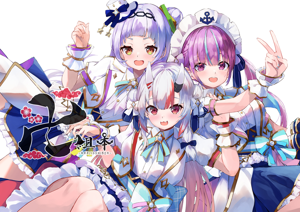 3girls :d anchor arm_up black_hairband blue_bow blue_hair blue_nails blue_skirt bow breasts frilled_skirt frills grey_hair hair_bun hairband hat hololive horns jacket konkito medium_breasts minato_aqua mini_hat multicolored_hair multiple_girls murasaki_shion nail_polish nakiri_ayame oni open_clothes open_jacket open_mouth orange_eyes puffy_short_sleeves puffy_sleeves purple_eyes purple_hair red_eyes red_hair shirt short_sleeves simple_background single_side_bun skin-covered_horns skirt smile streaked_hair tilted_headwear v virtual_youtuber white_background white_headwear white_jacket white_shirt wrist_cuffs