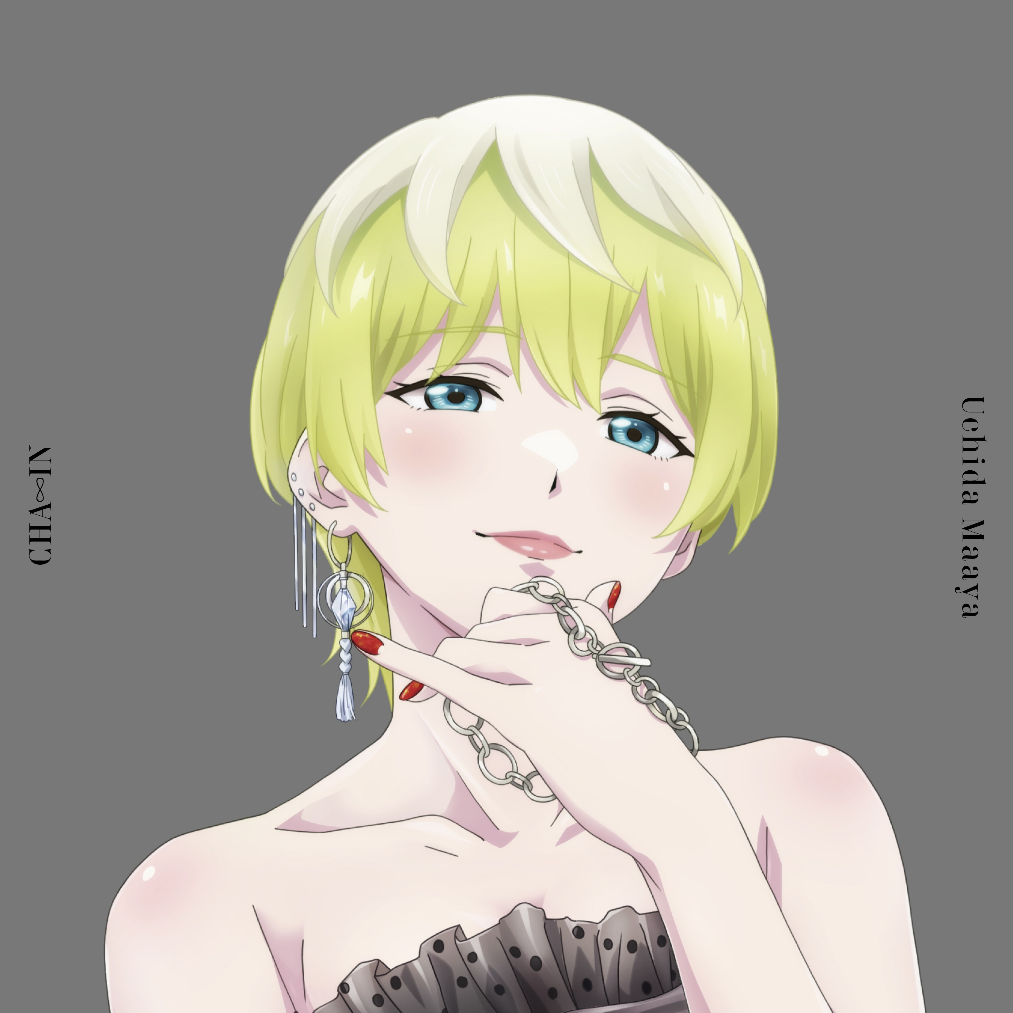 absurdres album_cover bare_arms bare_shoulders blue_eyes blush close-up cover earrings english_text female_focus green_hair highres izumo_tenka jewelry lips looking_at_viewer mato_seihei_no_slave official_art red_nails short_hair simple_background uchida_maaya