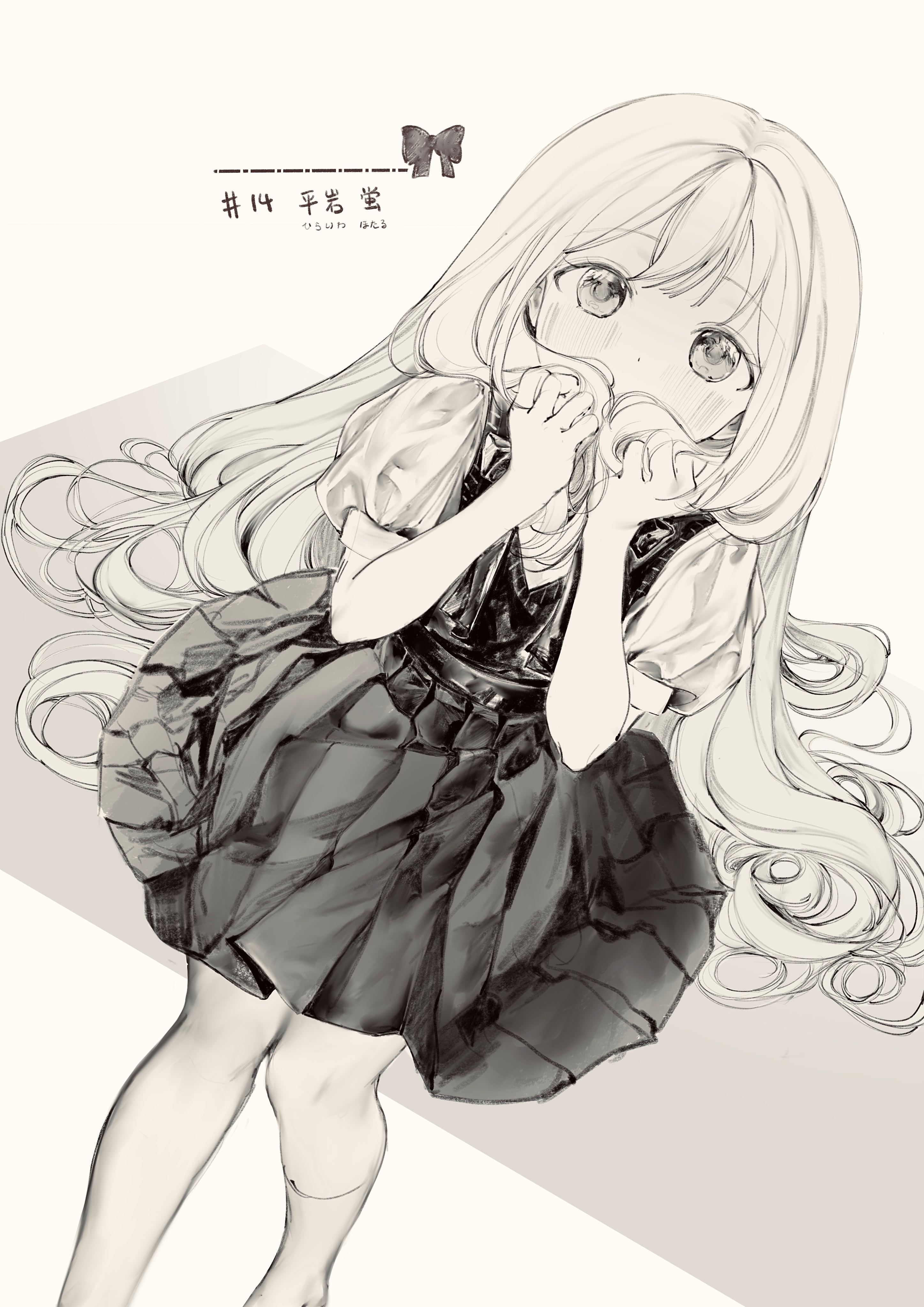 1girl absurdres bow check_copyright chinese_commentary commentary_request copyright_request covering_own_mouth dress eyelashes feet_out_of_frame giraffe_three greyscale hair_spread_out highres holding holding_own_hair kneehighs long_hair looking_at_viewer monochrome open_clothes open_vest original puffy_short_sleeves puffy_sleeves shadow shirt short_dress short_sleeves simple_background single_kneehigh single_sock sitting socks solo sweater sweater_dress v-neck very_long_hair vest white_background