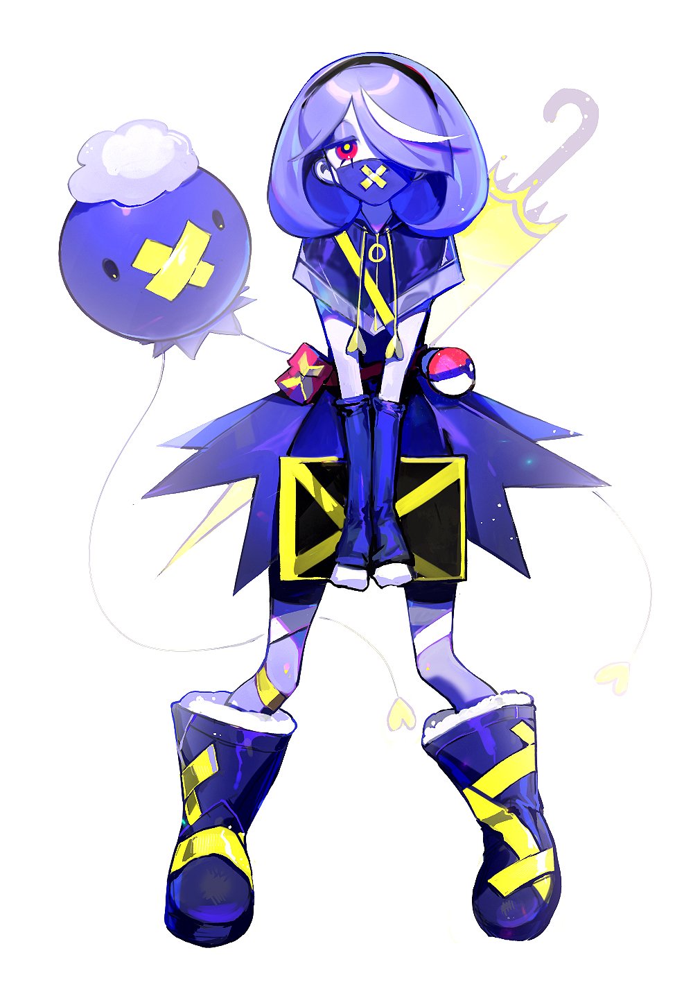 1girl black_hairband blue_dress blue_footwear book boots commentary dress drifloon eungo eyelashes full_body gen_4_pokemon hair_over_one_eye hairband half-closed_eyes highres holding holding_book knees_together_feet_apart mask mouth_mask nintendo original poke_ball pokemon pokemon_(creature) purple_hair red_eyes short_hair umbrella waist_poke_ball white_background