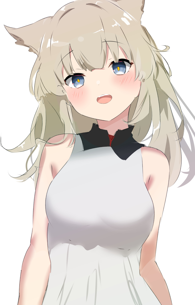 1girl animal_ears arknights arknights:_endfield bare_shoulders bird_ears blonde_hair blue_eyes blush breasts highres looking_at_viewer medium_breasts open_mouth perlica_(arknights) raifu_(rf) shirt simple_background sleeveless sleeveless_shirt solo upper_body white_background white_shirt yellow_pupils