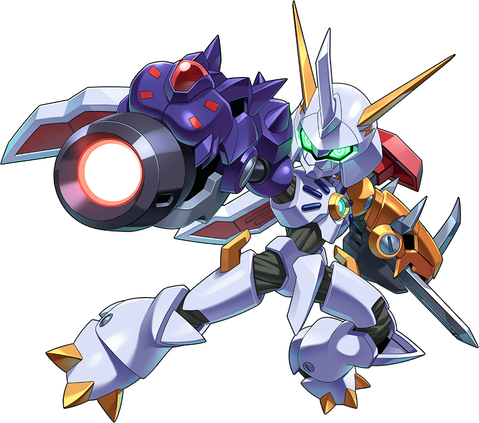 armor artist_request blue_eyes digimon full_body gun highres horns mecha medal_(medarot) medarot medarot_(robot) omegaknight omegamon robot simple_background sword weapon white_background