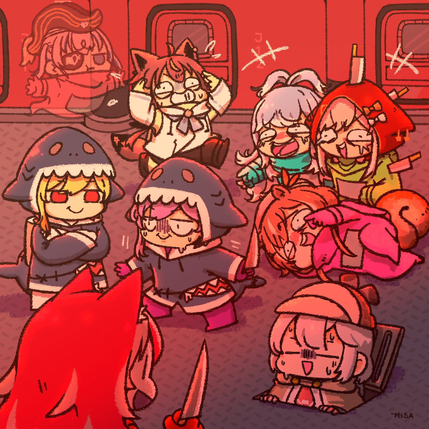 6+girls airani_iofifteen among_us animal_ears anya_melfissa ayunda_risu blonde_hair blue_eyes blue_hair brown_hair cosplay crewmate_(among_us) crewmate_(among_us)_(cosplay) cyan_(among_us) cyan_(among_us)_(cosplay) eyepatch gawr_gura gawr_gura_(cosplay) ghost_(among_us) ghost_(among_us)_(cosplay) grey_hair hair_ornament hat highres hololive hololive_english hololive_indonesia hood houshou_marine houshou_marine_(cosplay) kaela_kovalskia knife kobo_kanaeru kureiji_ollie laughing lime_(among_us) lime_(among_us)_(cosplay) long_hair moona_hoshinova multicolored_hair multiple_girls ookami_mio ookami_mio_(cosplay) open_mouth pavolia_reine pink_(among_us) pink_(among_us)_(cosplay) pink_hair pointing purple_hair red_eyes red_hair shirakami_fubuki shirakami_fubuki_(cosplay) smile squirrel_ears squirrel_girl squirrel_tail sweat tail vestia_zeta virtual_youtuber wakatsuki_misato watson_amelia watson_amelia_(cosplay)
