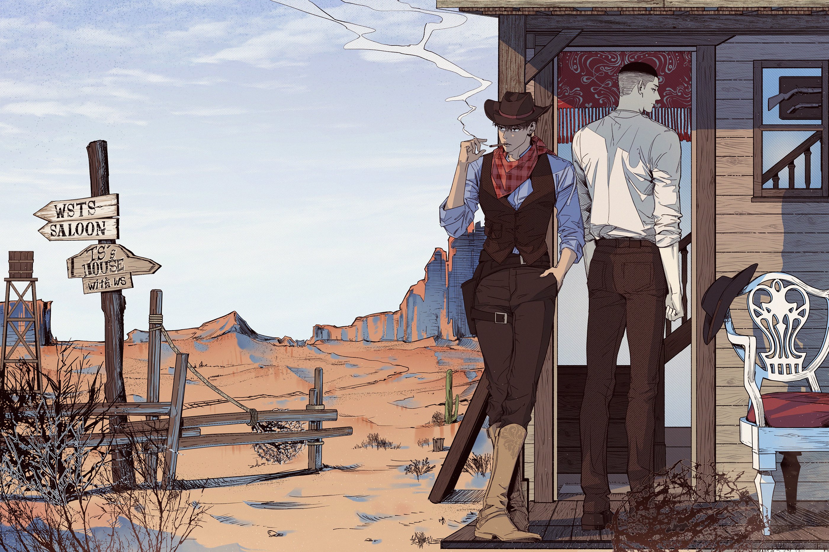 2boys ascot back black_eyes black_hair boots brown_eyes brown_hair brown_headwear buzz_cut canyon cowboy cowboy_boots cowboy_hat cowboy_western day desert earrings full_body hand_in_pocket hat highres holster jewelry leaning_back male_focus miyagi_ryouta multiple_boys nolja_cz outdoors porch red_ascot sawakita_eiji short_hair signpost slam_dunk_(series) smoke smoking stud_earrings undercut very_short_hair wavy_hair western