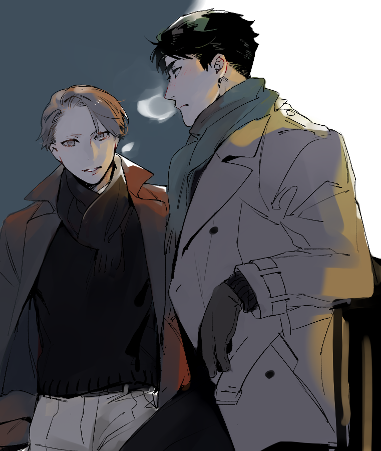 2boys black_hair black_sweater blush breath brown_gloves brown_hair brown_jacket brown_scarf closed_mouth commentary_request cowboy_shot expressionless gloves green_scarf grey_eyes grey_jacket grey_pants jacket joker_game light_smile long_sleeves looking_at_another male_focus miyoshi_(joker_game) multiple_boys nose_blush open_clothes open_jacket pants parted_lips profile sakuma_(joker_game) scarf shi646 short_hair sketch sweater swept_bangs unfinished