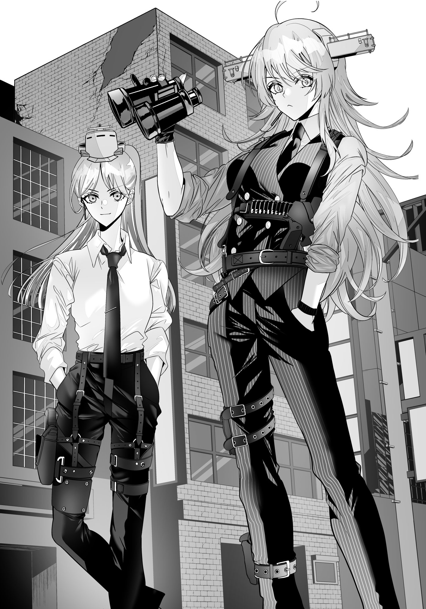 2girls ahoge alternate_costume anno88888 binoculars breasts building closed_mouth collared_shirt gloves greyscale gun hair_between_eyes hand_in_pocket headgear highres holding holster kantai_collection long_hair medium_breasts monochrome multiple_girls necktie outdoors pants partially_fingerless_gloves ponytail shirt sleeves_rolled_up south_dakota_(kancolle) thigh_holster vest washington_(kancolle) weapon