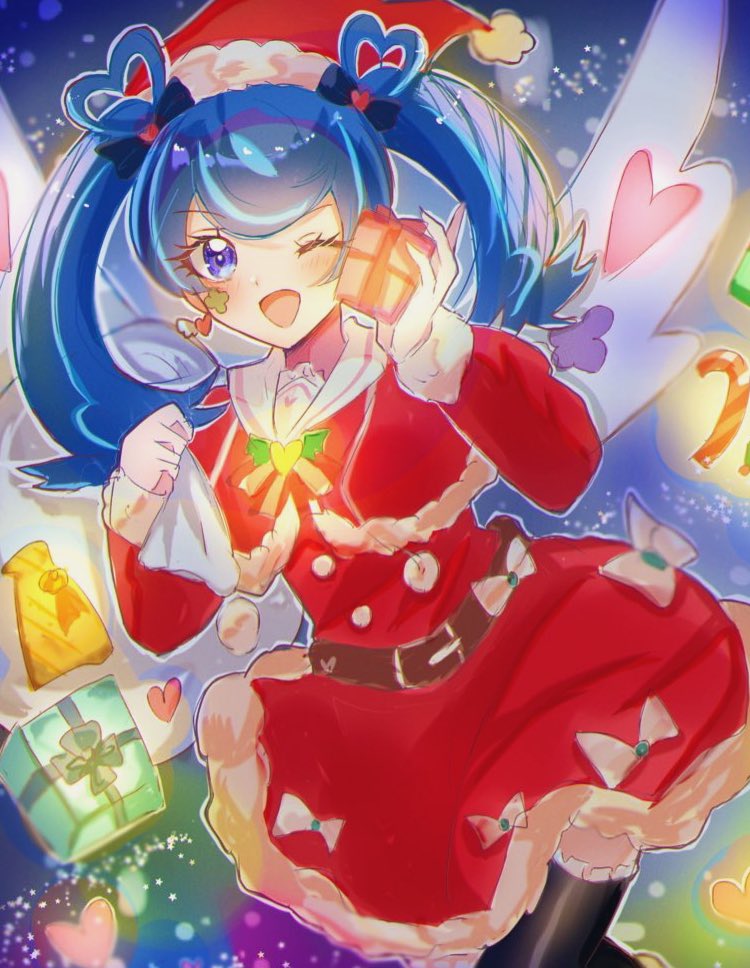 1girl ;d black_thighhighs blue_angel_(yu-gi-oh!) blue_eyes blue_hair box dress gift gift_box hat holding holding_gift holding_sack looking_at_viewer mo_0_06 one_eye_closed open_mouth red_dress red_hat sack santa_costume santa_dress santa_hat smile solo thighhighs twintails yu-gi-oh! yu-gi-oh!_vrains zaizen_aoi
