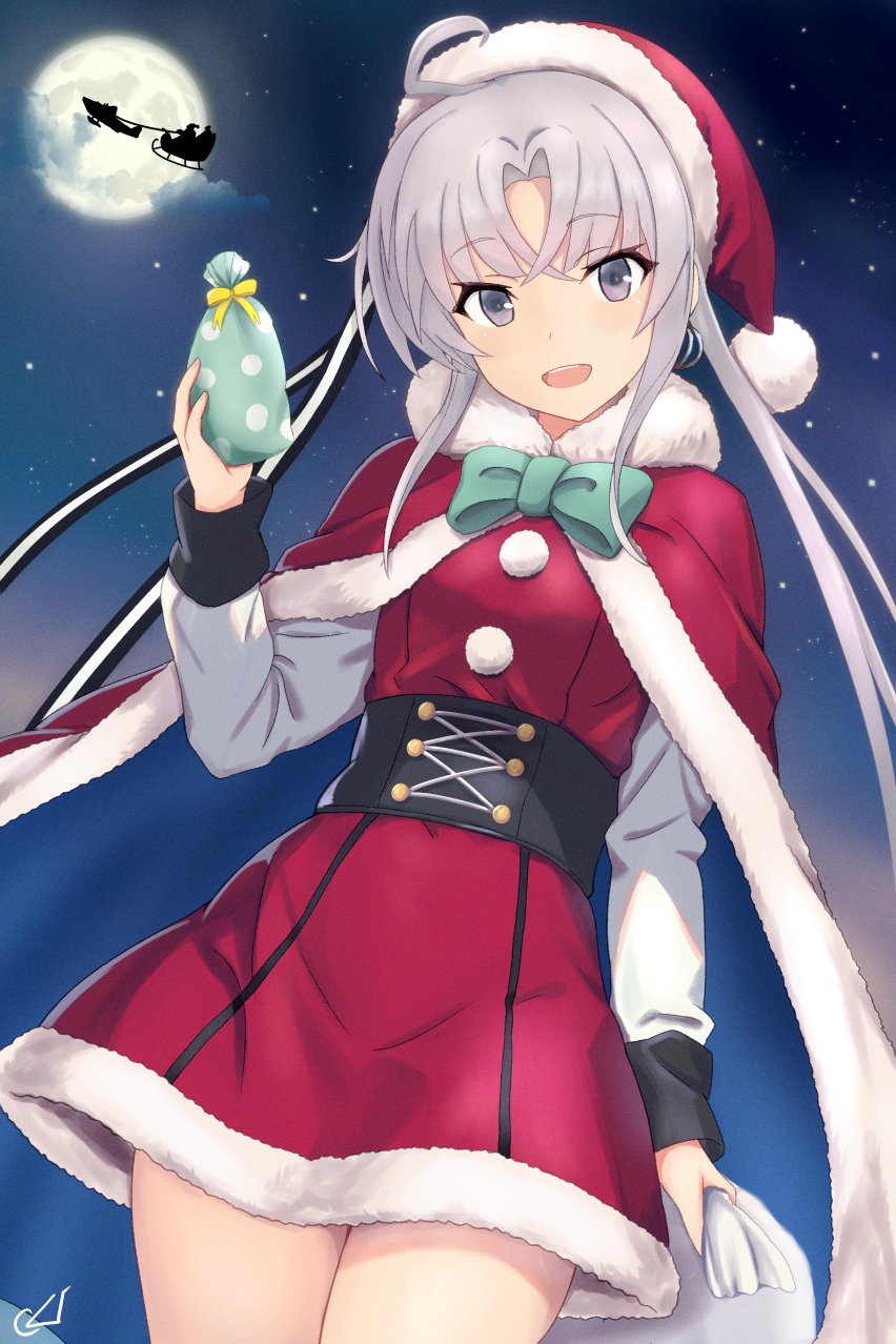 1girl akitsushima_(kancolle) blush bow cowboy_shot dress full_moon gift green_bow grey_hair hat highres holding holding_gift kantai_collection kotou_yogen long_hair long_sleeves looking_at_viewer moon night open_mouth pom_pom_(clothes) purple_eyes red_dress red_hat santa_costume santa_hat side_ponytail smile solo