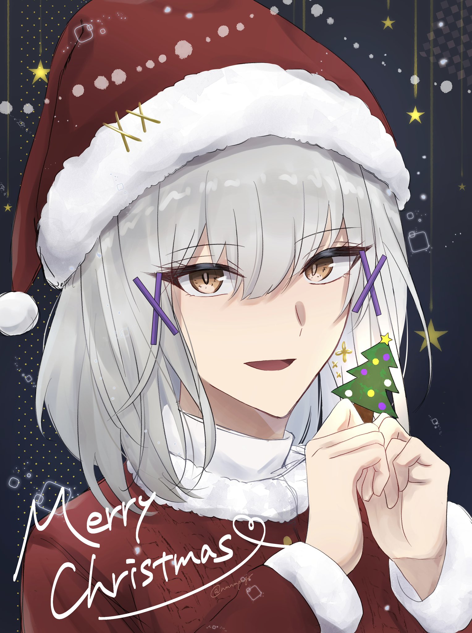 1girl alternate_costume brown_eyes christmas_tree commentary_request fur-trimmed_headwear fur-trimmed_sleeves fur_trim grey_hair hair_between_eyes hair_ornament hat highres long_sleeves medium_hair merry_christmas nmnmpngr open_mouth punishing:_gray_raven red_hat rosetta_(pgr) santa_costume santa_hat solo white_fur x_hair_ornament