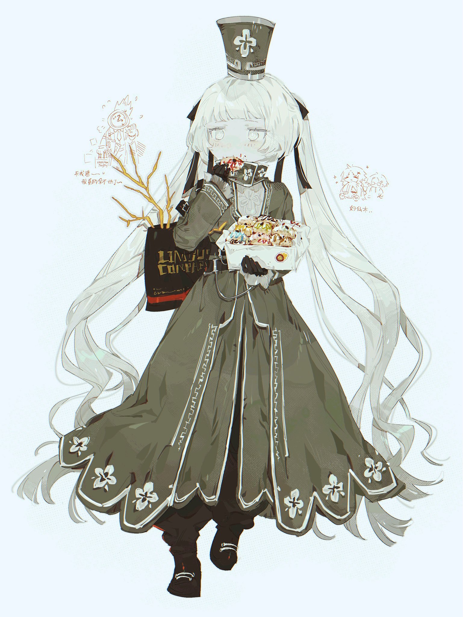 1boy 1girl 3girls aya_(project_moon) black_footwear black_gloves black_ribbon boots charon_(project_moon) dante_(limbus_company) dress full_body gloves golden_bough_(project_moon) grey_dress hair_ribbon hat highres hopkins_(project_moon) limbus_company meijiichigo multiple_girls project_moon ribbon shako_cap simple_background walking white_background yuri_(project_moon)