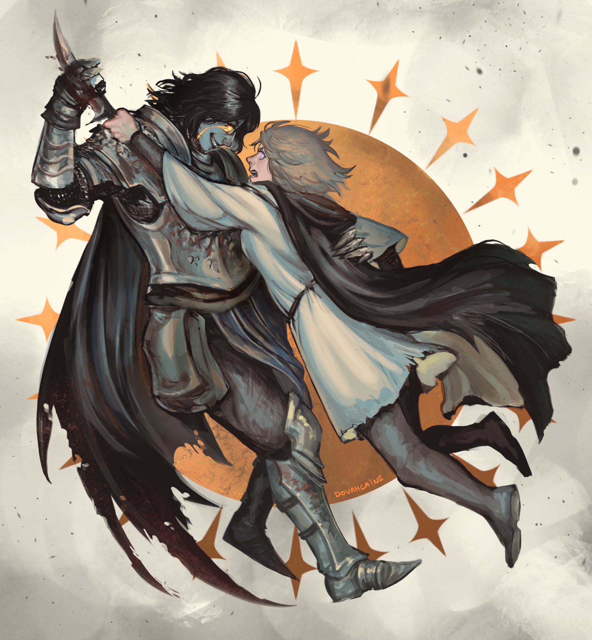 2girls armor artist_name battle black_hair black_lips blue_eyes breastplate brown_hair cape cloak dovahcaine elden_ring evil_grin evil_smile full_armor gauntlets gloam-eyed_queen glowing glowing_eyes grin highres holding holding_weapon hood hooded_cloak hug knight looking_at_another medium_hair melina_(elden_ring) multiple_girls open_mouth pale_skin pauldrons pidge_(dovahcaine) revenge scar sharp_teeth shoulder_armor shoulder_plates signature simple_background smile tarnished_(elden_ring) tears teeth unusually_open_eyes vambraces weapon yellow_eyes
