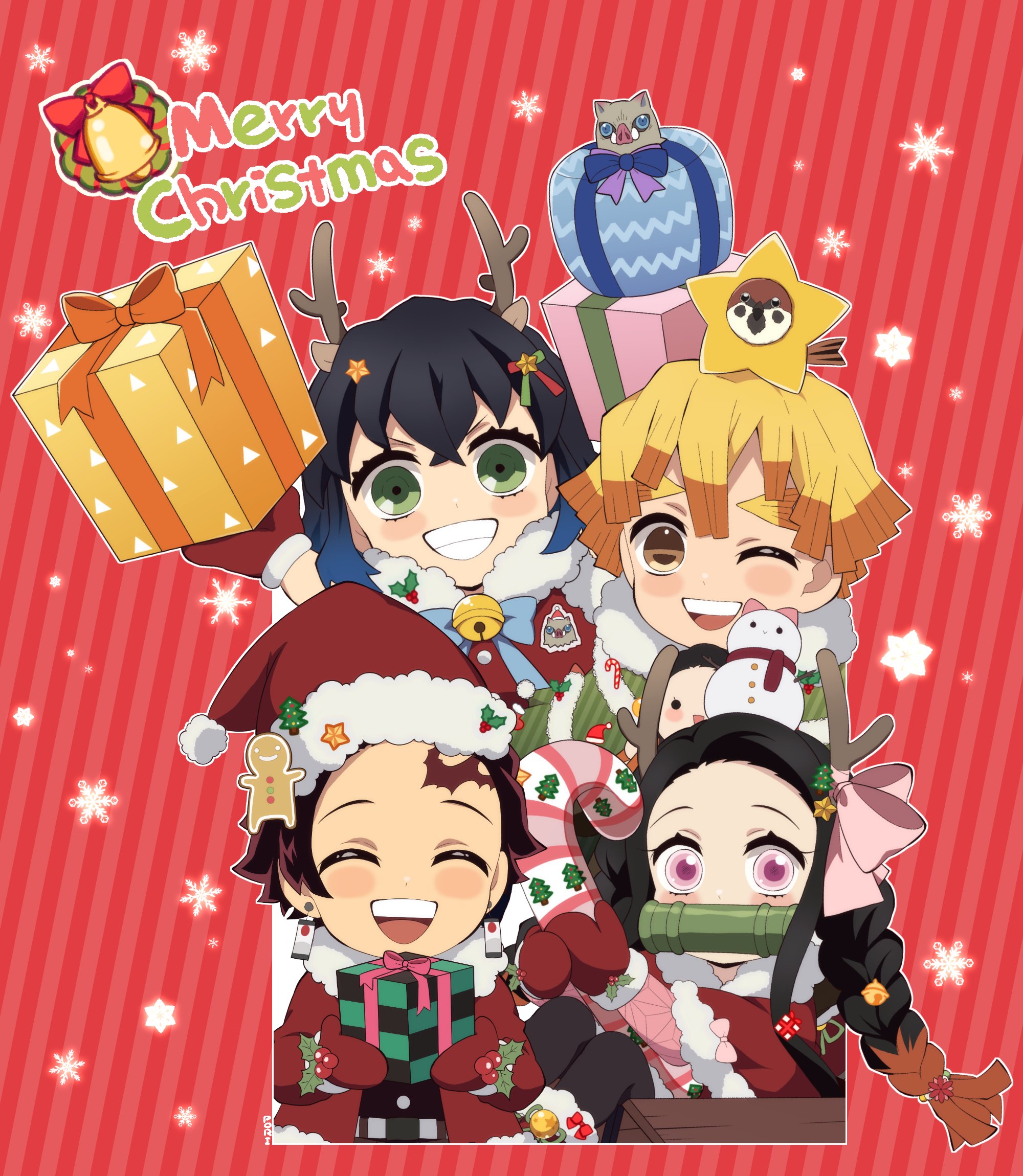 1girl 3boys agatsuma_zenitsu bamboo bell bit_gag black_hair blonde_hair blue_hair blush braid brown_eyes brown_hair chibi christmas chuntarou_(kimetsu_no_yaiba) demon_slayer_uniform earrings forehead gag gift gradient_hair green_eyes hair_ribbon hashibira_inosuke hat highres horns jacket japanese_clothes jewelry kamado_nezuko kamado_tanjirou kimetsu_no_yaiba kimono long_hair long_sleeves merry_christmas multicolored_hair multiple_boys one_eye_closed open_mouth pink_eyes pink_kimono pink_ribbon pori_(kmt_pori) red_jacket ribbon santa_hat scar scar_on_face scar_on_forehead short_hair smile snowman star_(symbol) teeth very_long_hair
