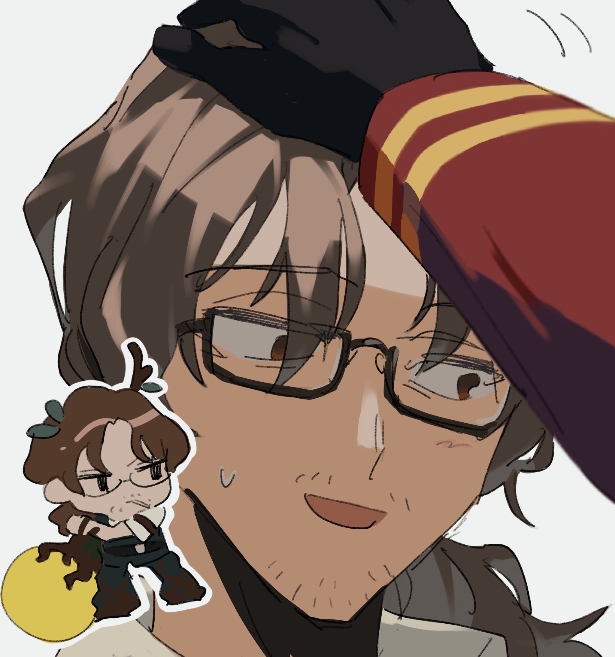 1boy 1other beard_stubble black_gloves brown_eyes brown_hair dante_(limbus_company) e.g.o_(project_moon) facial_hair glasses gloves golden_apple_(project_moon) gregor_(project_moon) headpat highres legerdemain_(e.g.o) limbus_company low_ponytail male_focus meisenlcb open_mouth petting ponytail project_moon simple_background smile stubble white_background
