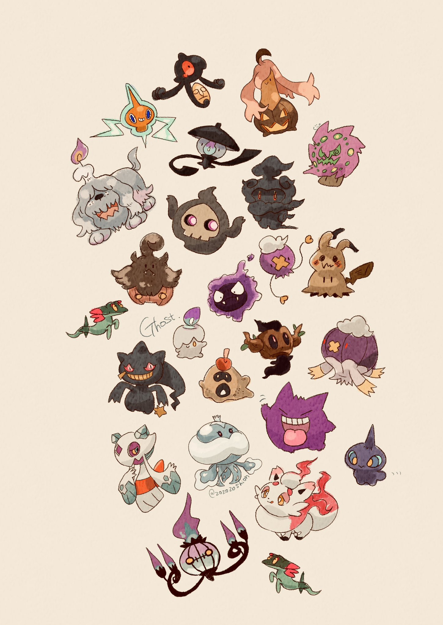 animal_focus artist_name banette chandelure closed_mouth commentary dog dreepy drifblim drifloon duskull fangs fire froslass gastly gen_1_pokemon gen_3_pokemon gen_4_pokemon gen_5_pokemon gen_6_pokemon gen_7_pokemon gen_8_pokemon gengar gourgeist greavard grin highres hisuian_zorua jellicent jellicent_(male) lampent legendary_pokemon litwick marshadow mimikyu mythical_pokemon nintendo no_humans phantump pokemon pokemon_(creature) pumpkaboo purple_fire red_eyes rotom sandygast shuppet simple_background skin_fangs smile solid_oval_eyes spiritomb tail teeth tongue tongue_out trait_connection twitter_username white_background yamask yellow_eyes zozozoshion