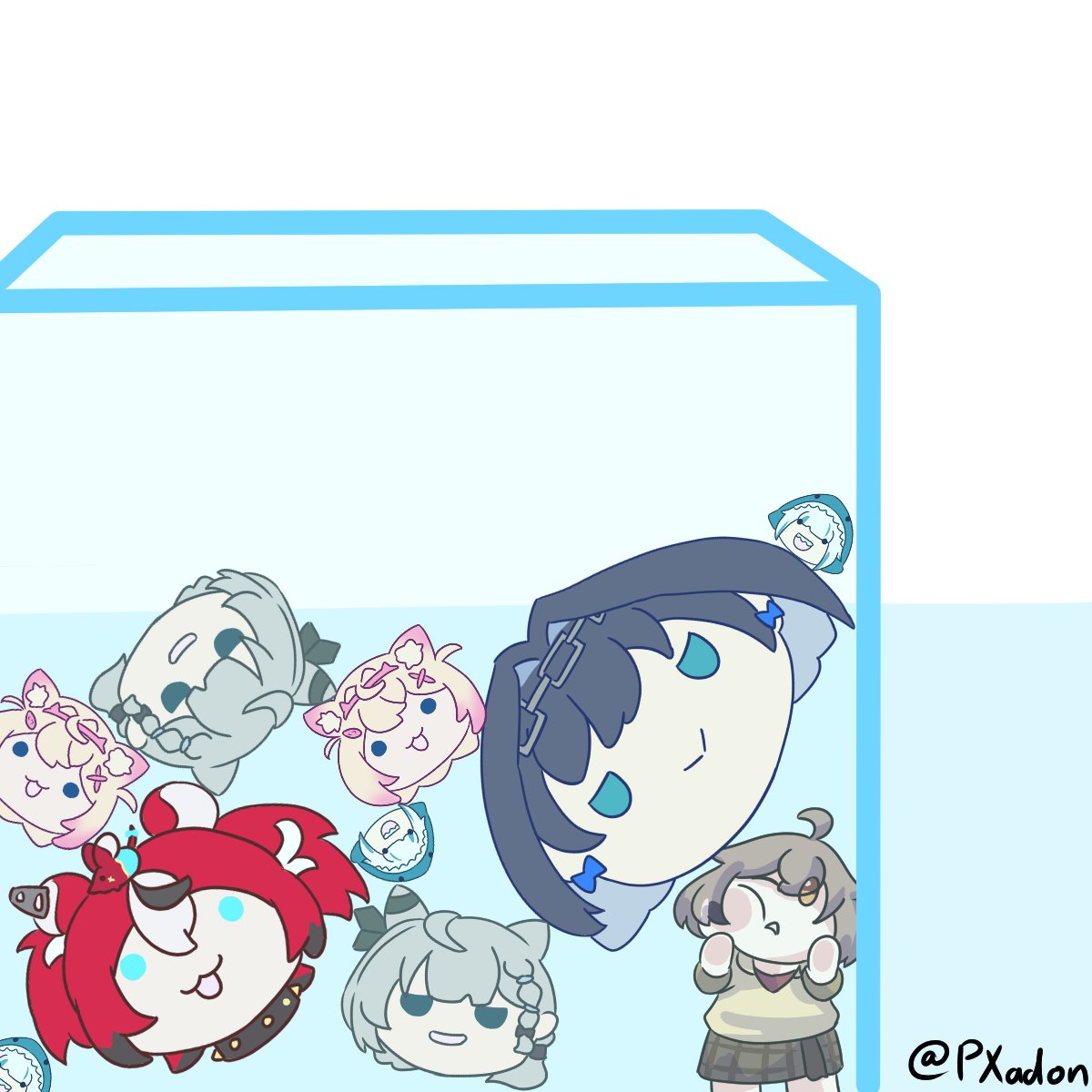 6+girls ahoge animal_ears animal_hood black_hair blonde_hair blue_eyes braid brown_eyes brown_hair brown_skirt cat_ears chain chain_headband dog_ears gawr_gura grey_hair hakos_baelz highres hololive hololive_english hololive_indonesia hood mococo_abyssgard mr._squeaks_(hakos_baelz) multicolored_hair multiple_girls nanashi_mumei ouro_kronii pink_hair plaid_clothes plaid_skirt pyra_xadon red_hair shark_hood skirt squishing streaked_hair suika_game sweater twitter_username two-tone_hair vestia_zeta virtual_youtuber
