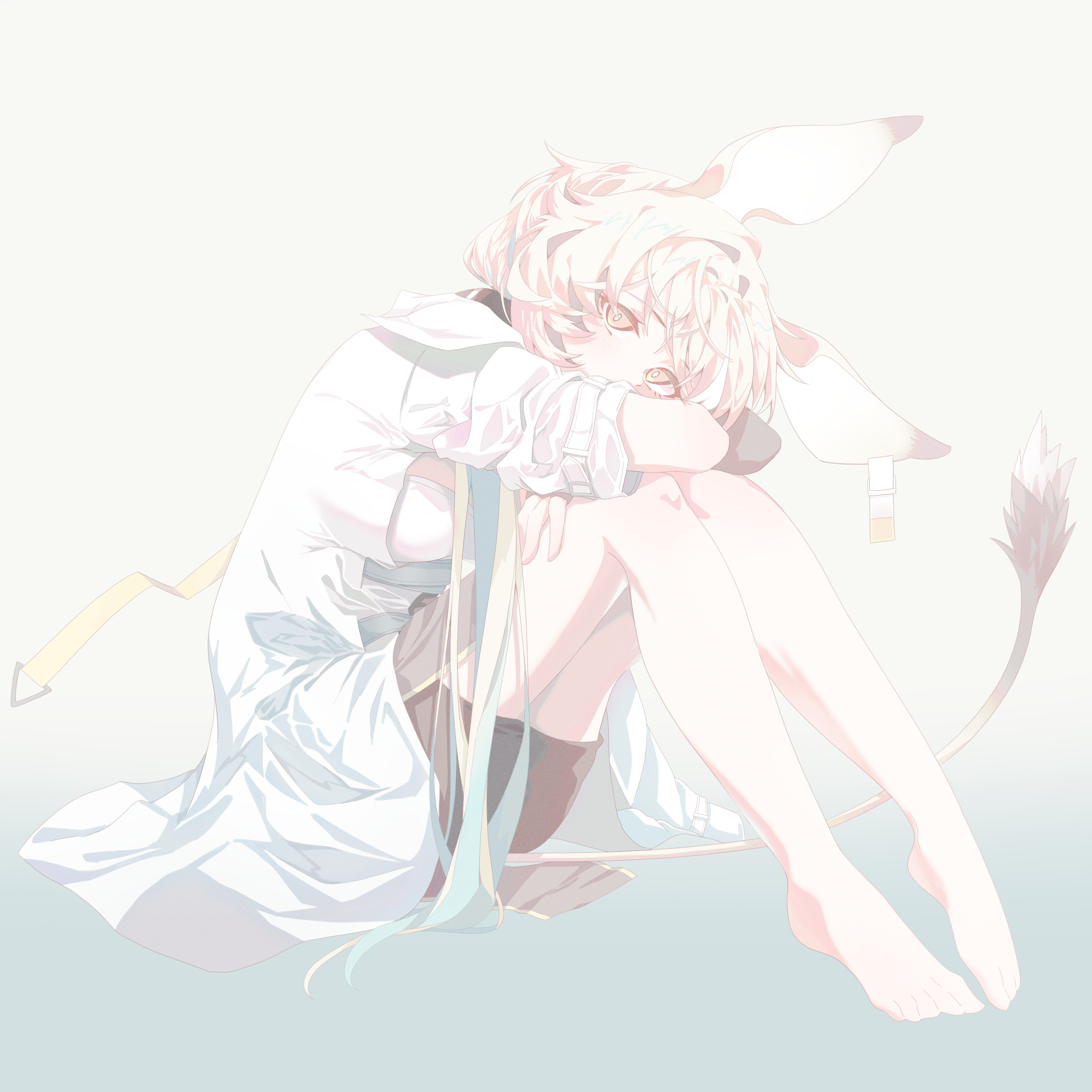 1girl absurdres animal_ears arknights bare_legs barefoot black_shorts blonde_hair coat commentary dorothy_(arknights) gradient_background grey_background highres hugging_own_legs knees_up kujou_koto lab_coat long_hair looking_at_viewer mouse_ears mouse_girl mouse_tail shirt shorts solo tail very_long_hair white_coat white_shirt yellow_eyes