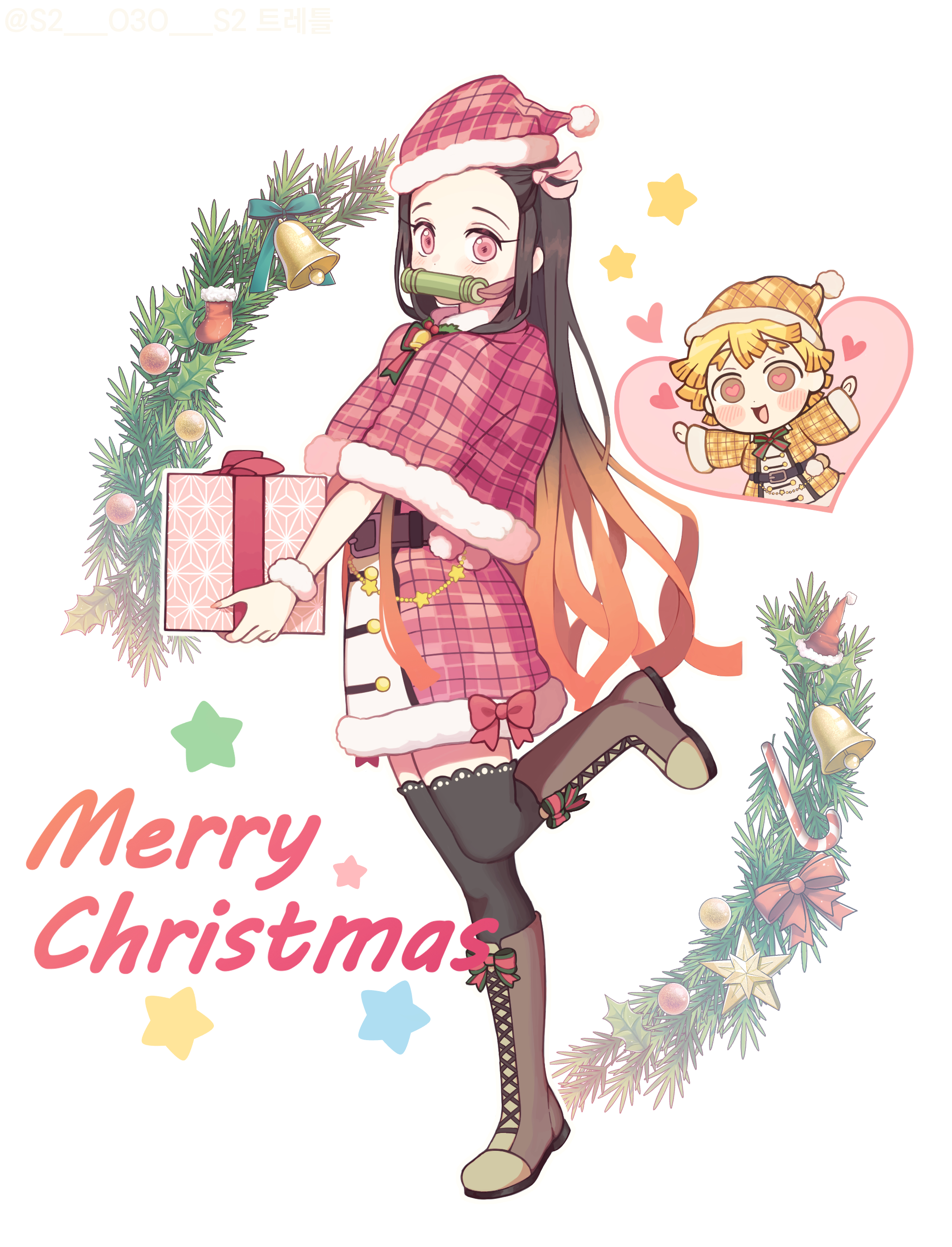 1girl absurdres agatsuma_zenitsu bamboo bit_gag black_hair black_thighhighs blonde_hair boots capelet chibi christmas commentary_request dress gag gagged gift hair_ribbon hat heart heart_in_eye highres holding holding_gift kamado_nezuko kimetsu_no_yaiba korean_commentary long_hair long_sleeves merry_christmas multicolored_hair open_mouth orange_hair pink_eyes pink_ribbon red_capelet red_dress ribbon santa_hat shimya symbol_in_eye thighhighs