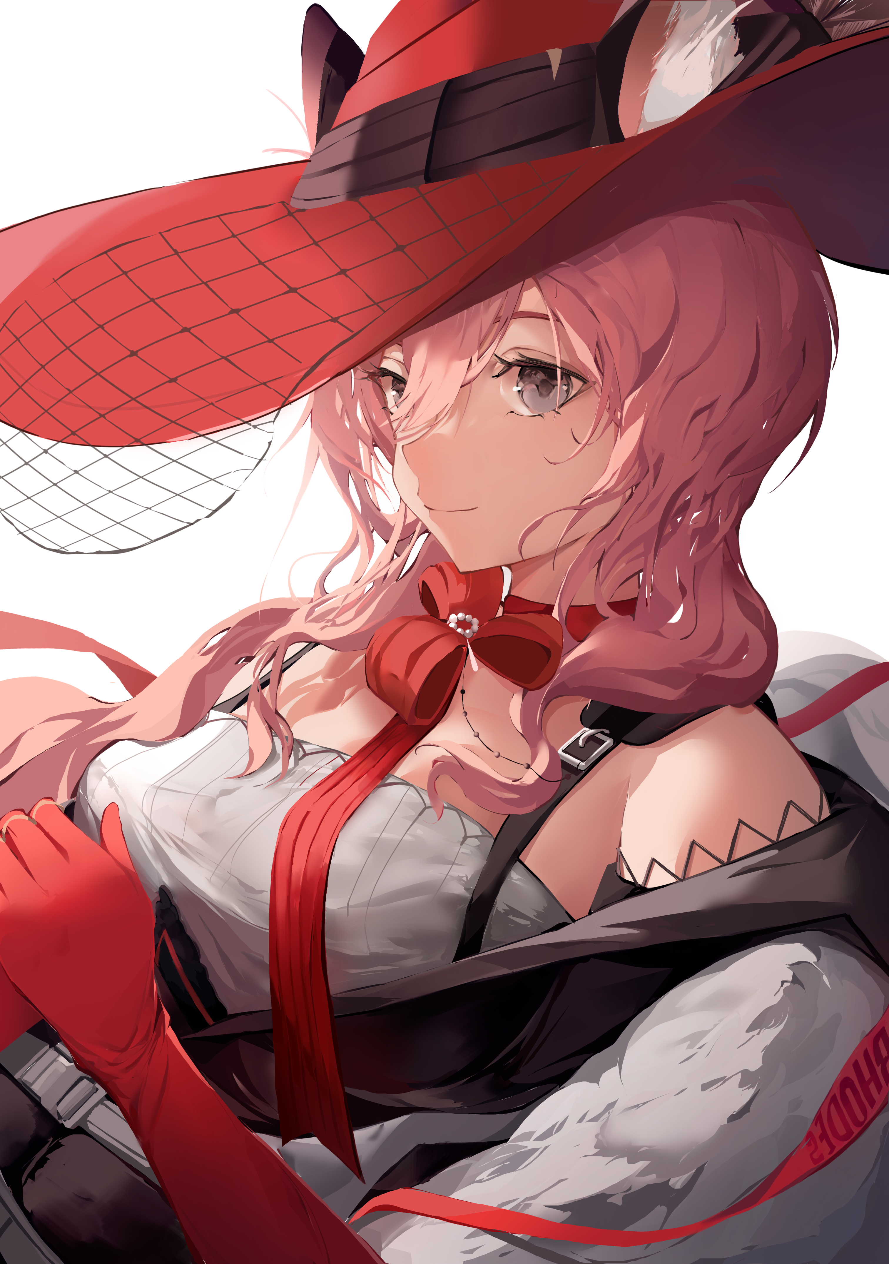 1girl absurdres animal_ears arknights breasts cat_ears ears_through_headwear feather_boa gloves grey_eyes hair_between_eyes hat heidi_(arknights) highres long_hair looking_at_viewer medium_breasts pink_hair red_gloves red_hat shirt simple_background smile solo upper_body white_background white_shirt yonjuri