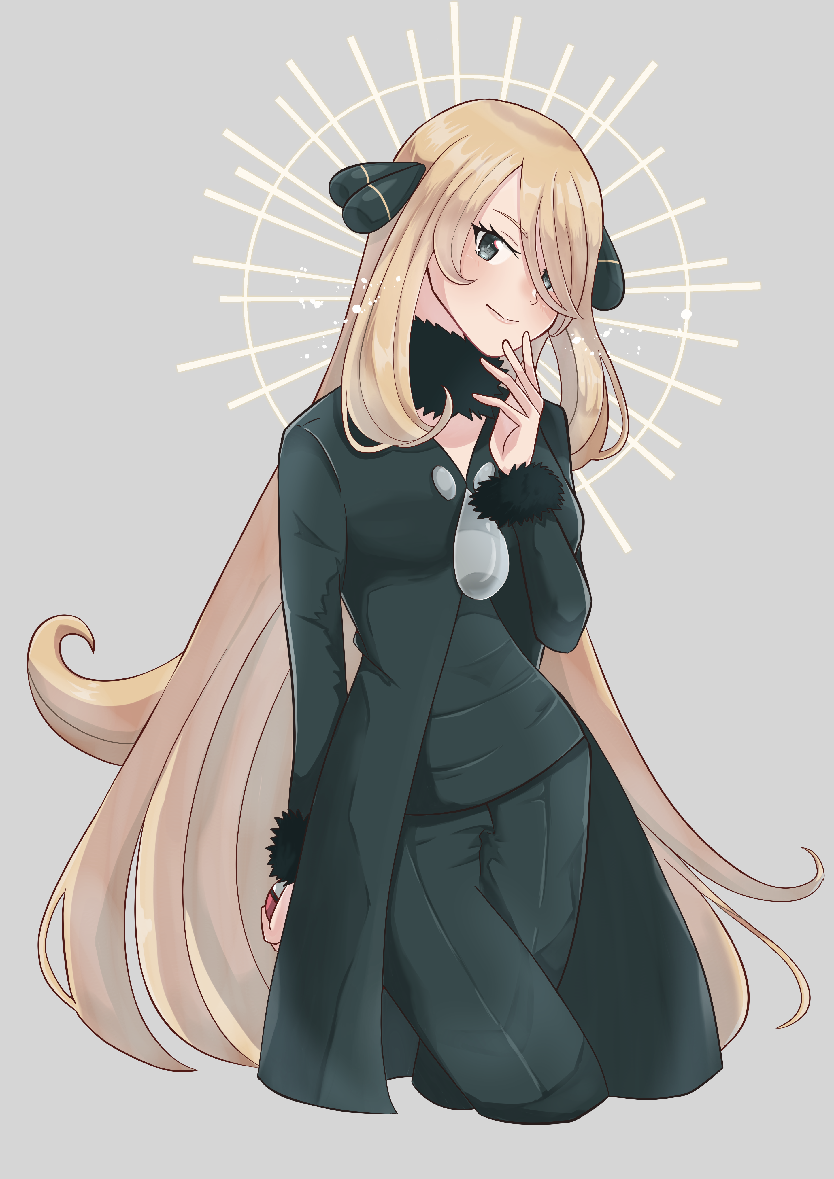 1girl absurdres black_coat black_pants black_shirt blonde_hair coat come2traveling commission cropped_legs cynthia_(pokemon) fur-trimmed_coat fur_collar fur_trim grey_background grey_eyes hair_ornament hair_over_one_eye highres long_hair long_sleeves looking_at_viewer nintendo pants pokemon pokemon_diamond/pearl/platinum shirt smile solo very_long_hair