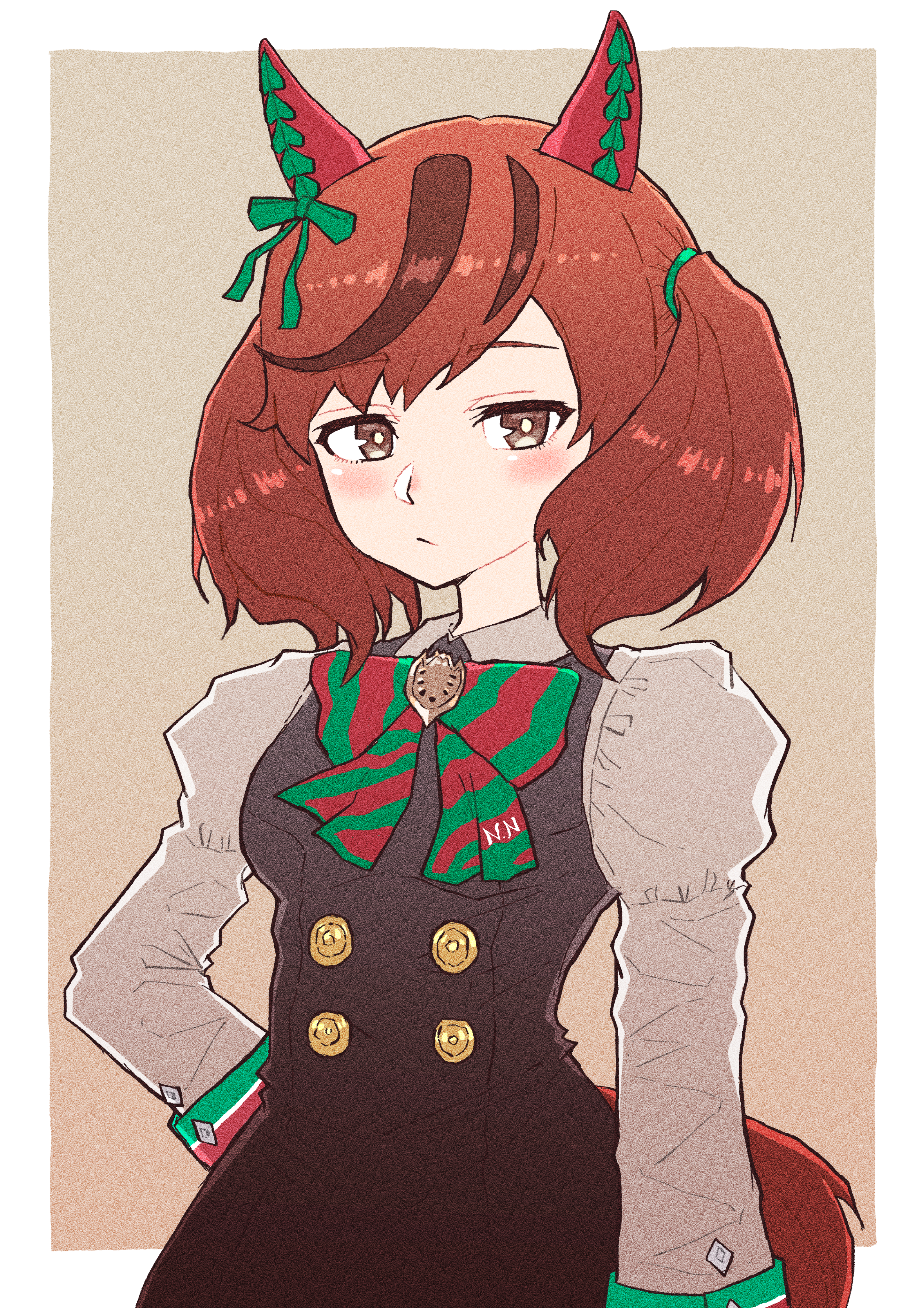 1girl absurdres animal_ears black_dress border brown_background brown_eyes brown_hair dress ear_covers highres horse_ears horse_girl long_sleeves looking_at_viewer medium_hair multicolored_hair nenbutsu_0416 nice_nature_(umamusume) simple_background sleeveless sleeveless_dress solo streaked_hair twintails umamusume white_border