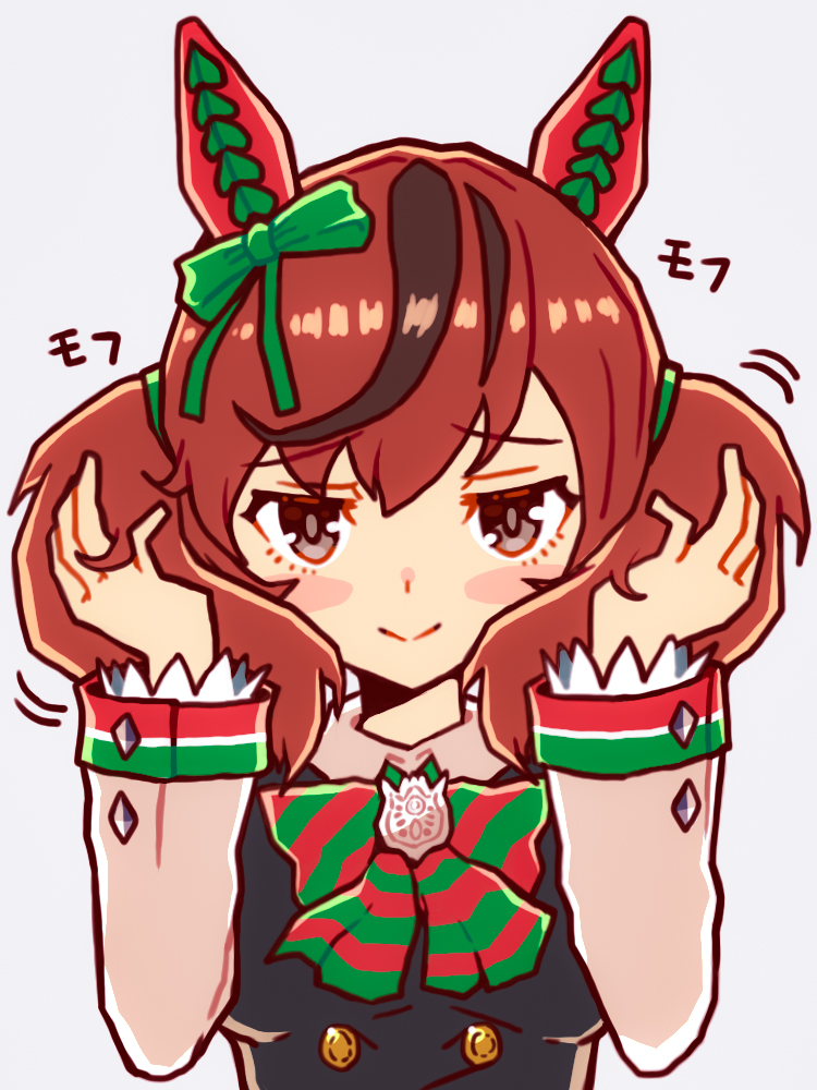 1girl animal_ears brown_eyes brown_hair ear_covers grey_background horse_ears horse_girl long_sleeves looking_at_viewer medium_hair multicolored_hair nenbutsu_0416 nice_nature_(umamusume) simple_background smile solo streaked_hair twintails umamusume upper_body