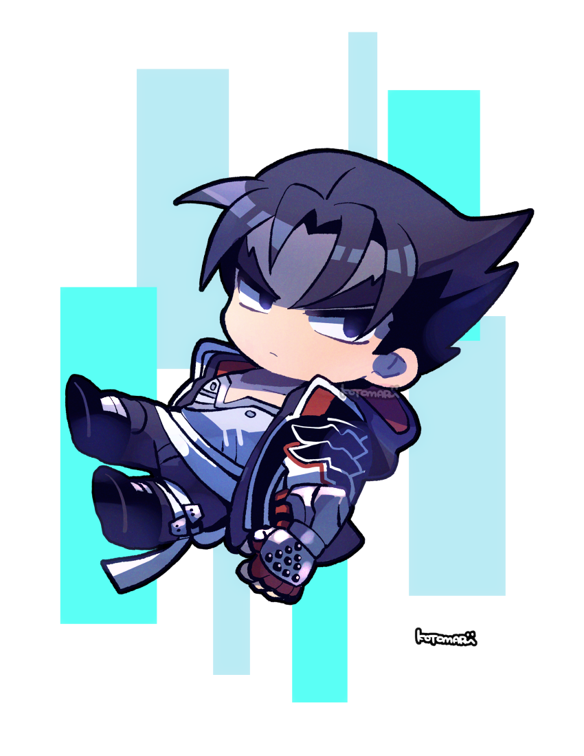 1boy arm_at_side black_footwear black_hair black_jacket black_pants closed_mouth floating gloves grey_shirt jacket kazama_jin kotomaru_(kotokoto_kottan) looking_to_the_side male_focus pants red_gloves shirt short_hair solo studded_gloves tekken thick_eyebrows v-shaped_eyebrows