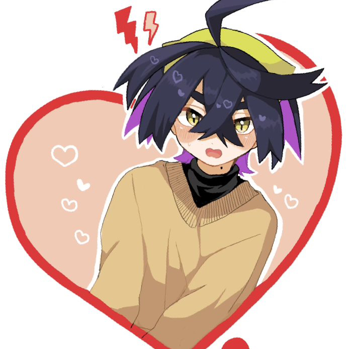 1boy ahoge alternate_costume black_hair black_shirt blush brown_sweater colored_inner_hair commentary_request crossed_bangs hair_between_eyes hayashi_(pixiv) headband heart kieran_(pokemon) male_focus mole mole_on_neck multicolored_hair nintendo open_mouth pokemon pokemon_scarlet_and_violet purple_hair shirt short_hair sweater turtleneck two-tone_hair undershirt upper_body yellow_eyes yellow_headband