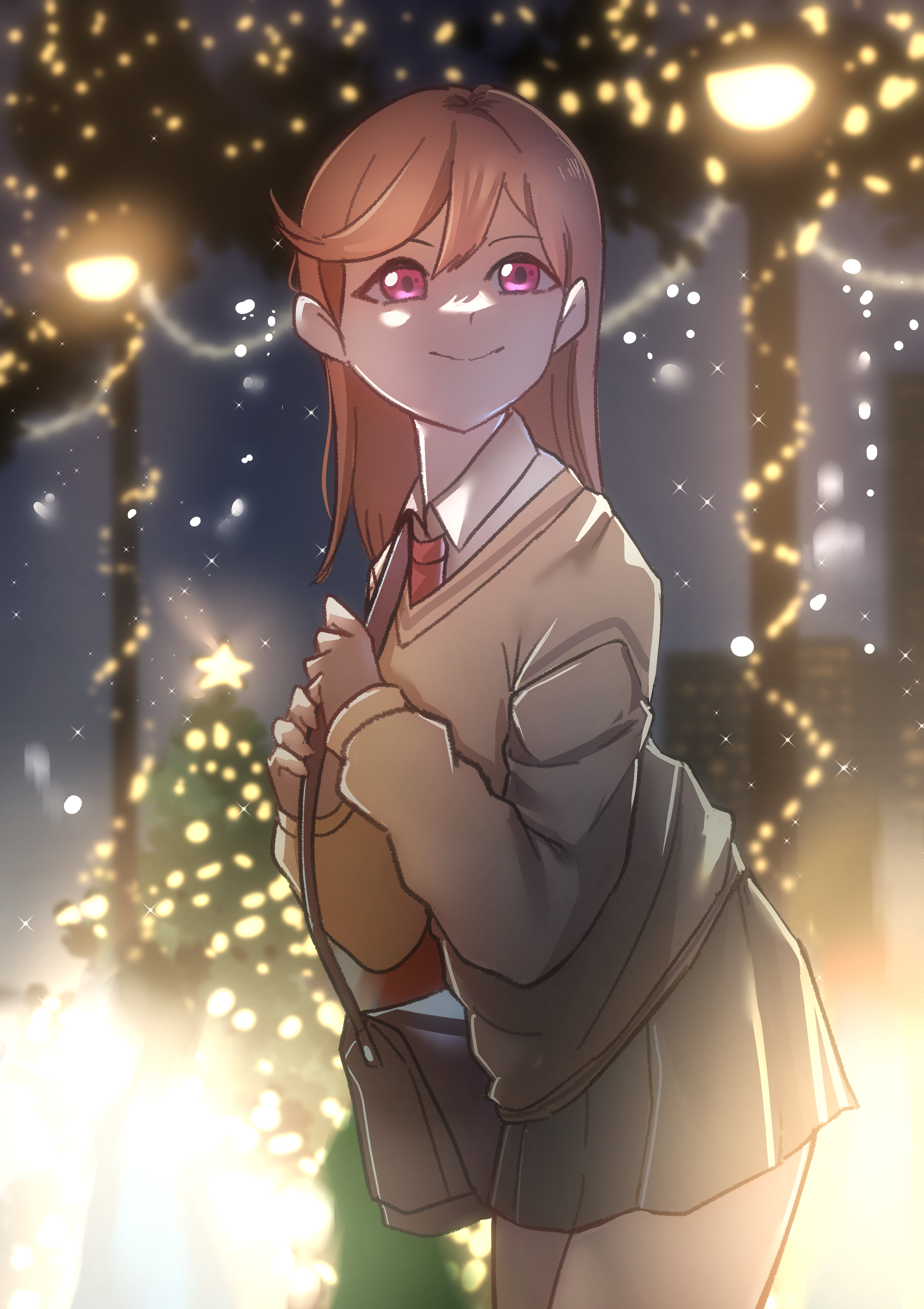1girl absurdres christmas highres long_hair looking_at_viewer love_live! love_live!_superstar!! night orange_hair over_flow99 purple_eyes shibuya_kanon smile solo