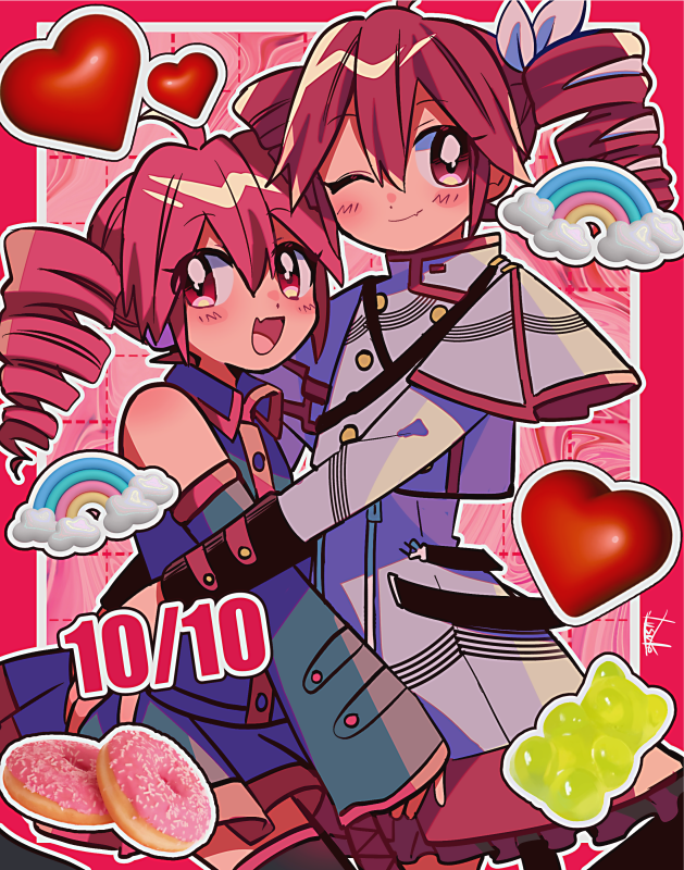 2girls ;) ahoge bare_shoulders blue_shirt blue_skirt blue_sleeves candy closed_mouth donut drill_hair fang food gummy_bear hair_ribbon heart height_difference hug kasane_teto kasane_teto_(sv) kasane_teto_(utau) long_sleeves multiple_girls official_alternate_costume one_eye_closed open_mouth outline pink_background pink_eyes pink_hair rainbow ribbon shirt skirt sleeveless sleeveless_shirt smile synthesizer_v twin_drills utau white_outline white_ribbon white_shirt white_skirt yuusuke-kun