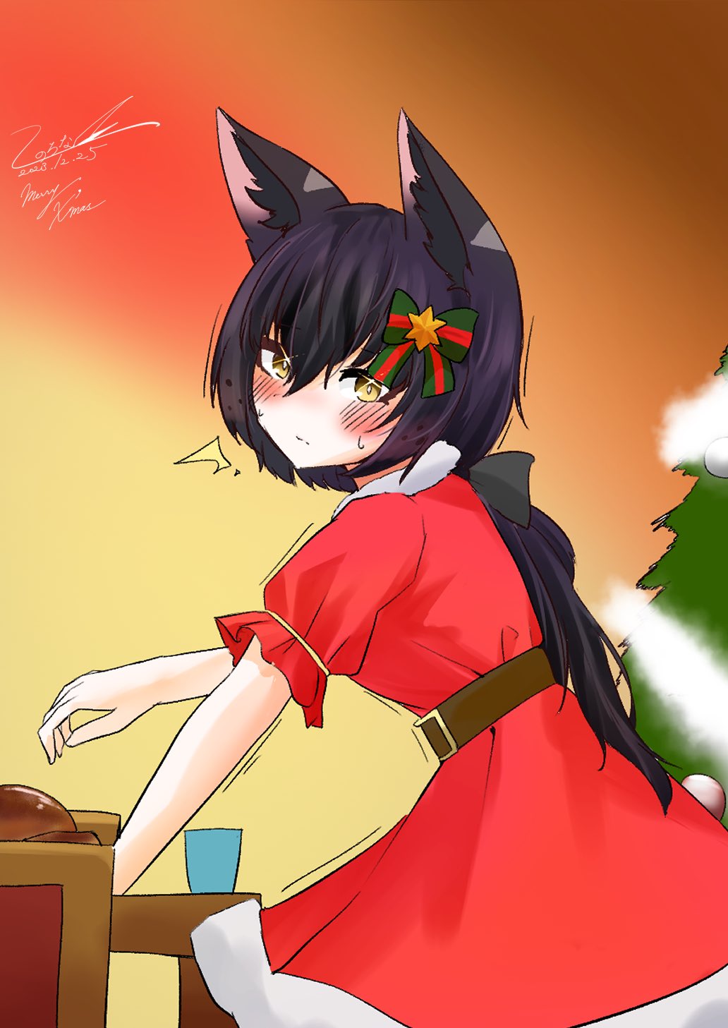 belt black_bow black_hair black_serval_(kemono_friends) blush bow brown_belt dress frilled_sleeves frills fur_collar fur_trim green_bow hair_between_eyes hair_bow highres kemono_friends long_hair looking_at_viewer low_ponytail ponytail red_bow red_dress santa_costume shironappa_46 short_sleeves sidelocks sweatdrop two-tone_bow white_fur yellow_eyes