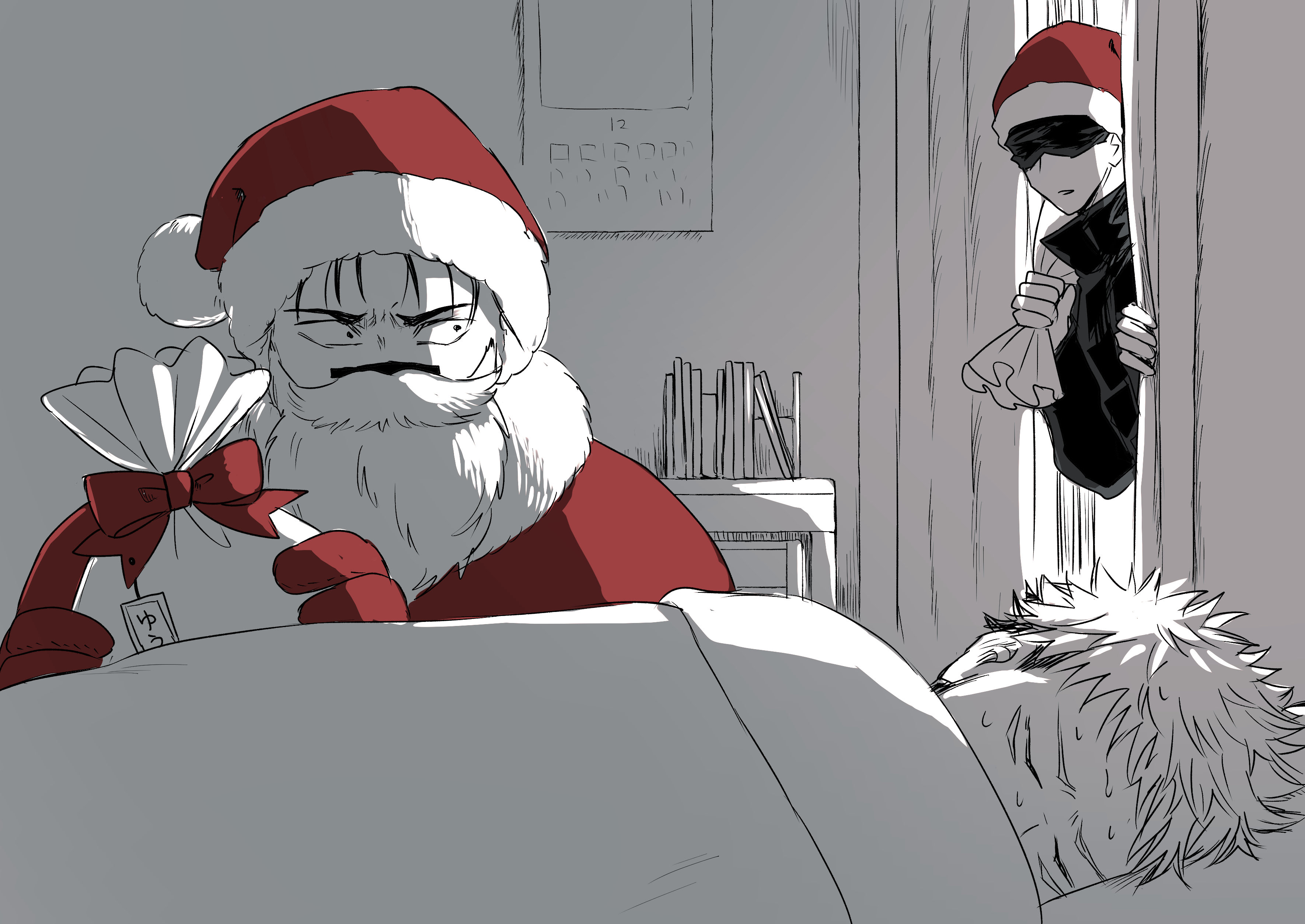 3boys absurdres bag beard blanket blindfold choso_(jujutsu_kaisen) closed_eyes covered_eyes facial_hair facial_mark facial_tattoo gloves gojo_satoru greyscale hat highres holding holding_bag indoors itadori_yuji jacket jujutsu_kaisen long_sleeves male_focus mineo406 monochrome multiple_boys red_gloves red_headwear red_jacket santa_costume santa_hat short_hair spot_color sweat tattoo under_covers v-shaped_eyebrows