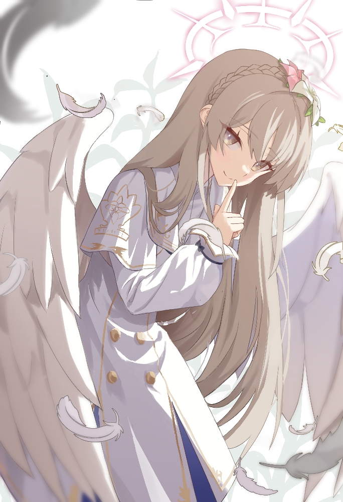 1girl angel_wings blue_archive braid brown_eyes buttons closed_mouth crown_braid double-breasted dress feathered_wings feathers flower hair_flower hair_ornament halo layered_sleeves light_blush light_brown_hair long_hair long_sleeves looking_at_viewer nagisa_(blue_archive) nikoneko sailor_collar sailor_dress short_over_long_sleeves short_sleeves shrug_(clothing) smile white_background white_dress white_sailor_collar white_shrug white_wings wings