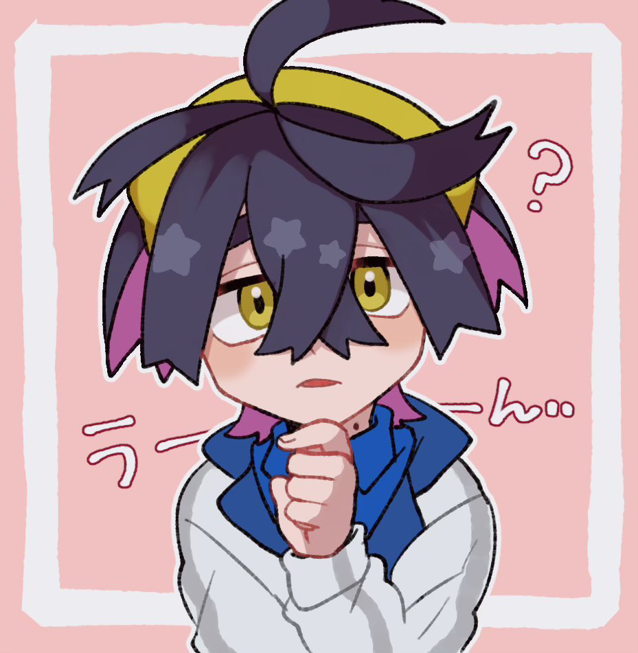 1boy ? black_hair blue_shirt collared_shirt colored_inner_hair commentary_request crossed_bangs gloves hair_between_eyes hand_to_chin hand_up hayashi_(pixiv) headband jacket kieran_(pokemon) long_sleeves looking_at_viewer male_focus mole mole_on_neck multicolored_hair necktie nintendo parted_lips pokemon pokemon_scarlet_and_violet purple_hair red_necktie shirt short_hair star_(symbol) thinking two-tone_hair upper_body white_jacket yellow_eyes yellow_headband
