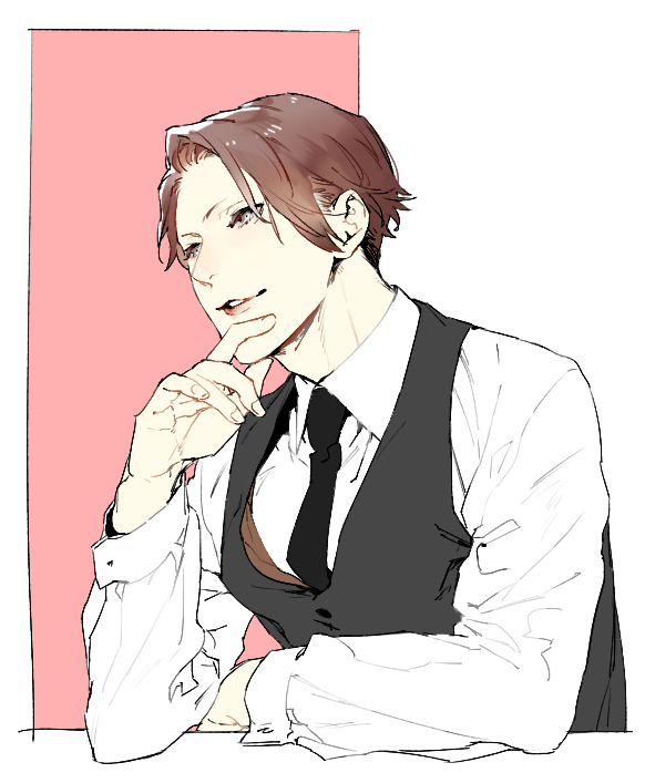 1boy black_necktie brown_eyes brown_hair collared_shirt commentary_request grey_vest hand_on_own_chin hand_to_own_mouth joker_game light_smile long_sleeves looking_ahead male_focus miyoshi_(joker_game) necktie parted_lips pink_background shi646 shirt short_hair simple_background solo swept_bangs upper_body vest waistcoat white_background white_shirt