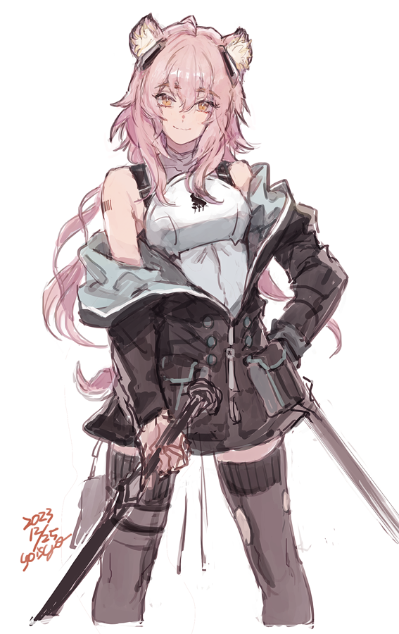 1girl animal_ears arknights armor barcode barcode_tattoo bare_shoulders black_jacket black_thighhighs breasts cropped_legs dated feet_out_of_frame gravel_(arknights) holding holding_sword holding_weapon jacket long_hair looking_at_viewer mouse_ears mouse_girl mouse_tail off_shoulder oisyox72 open_clothes open_jacket orange_eyes pink_hair shoulder_tattoo simple_background small_breasts smile solo sword tail tattoo thighhighs weapon white_background