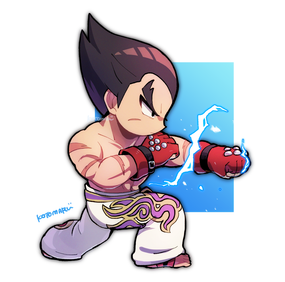 1boy black_eyes black_hair closed_mouth electricity fighting_stance from_side full_body gloves kotomaru_(kotokoto_kottan) male_focus mishima_kazuya navel pants punching red_gloves scar scar_on_arm scar_on_face short_hair signature solo studded_gloves tekken toned toned_male topless_male v-shaped_eyebrows white_pants